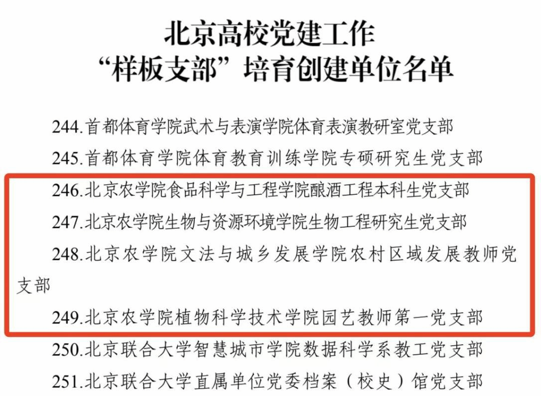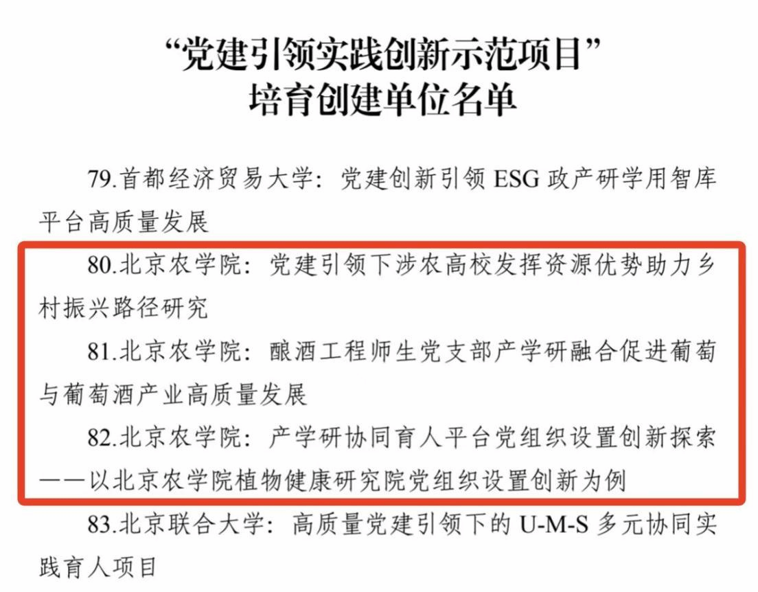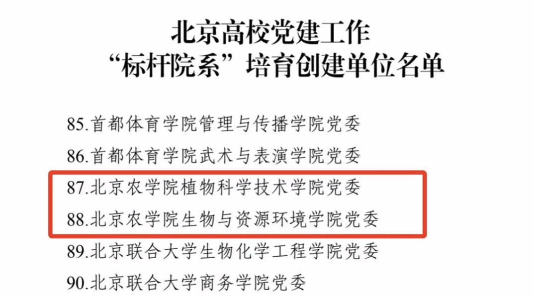 近日,北京市委教育工委公布了北京高校党建工作“标杆院系”“样板支部”“党建引领实践创新示范项目”培育创建单位名单,beat365中文官方网站申报的9项全部榜上有名。其中植物科学技术学院党委和生物与资源环境学院党委入选北京高校党建工作“标杆院系”培育创建单位;食品科学与工程学院酿酒工程本科生党支部、生物与资源环境学院生物工程研究生党支部、文法与城乡发展学院农村区域发展教师党支部、植物科学技术学院园艺教师第一党支部入选北京高校党建工作“样板支部”培育创建单位;“党建引领下涉农高校发挥资源优势助力乡村振兴路径研究”“产学研协同育人平台党组织设置创新探索——以beat365中文官方网站植物健康研究院党组织设置创新为例”“酿酒工程师生党支部产学研融合促进葡萄与葡萄酒产业高质量发展”三个项目入选“党建引领实践创新示范项目”培育创建单位。