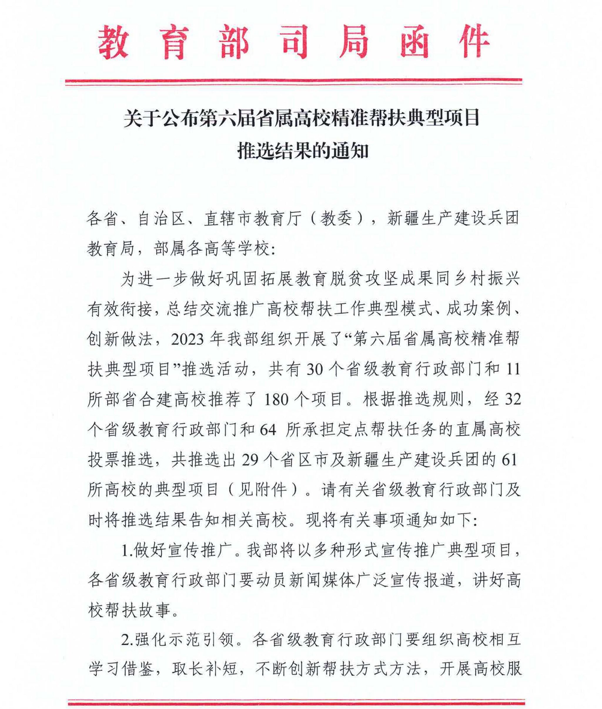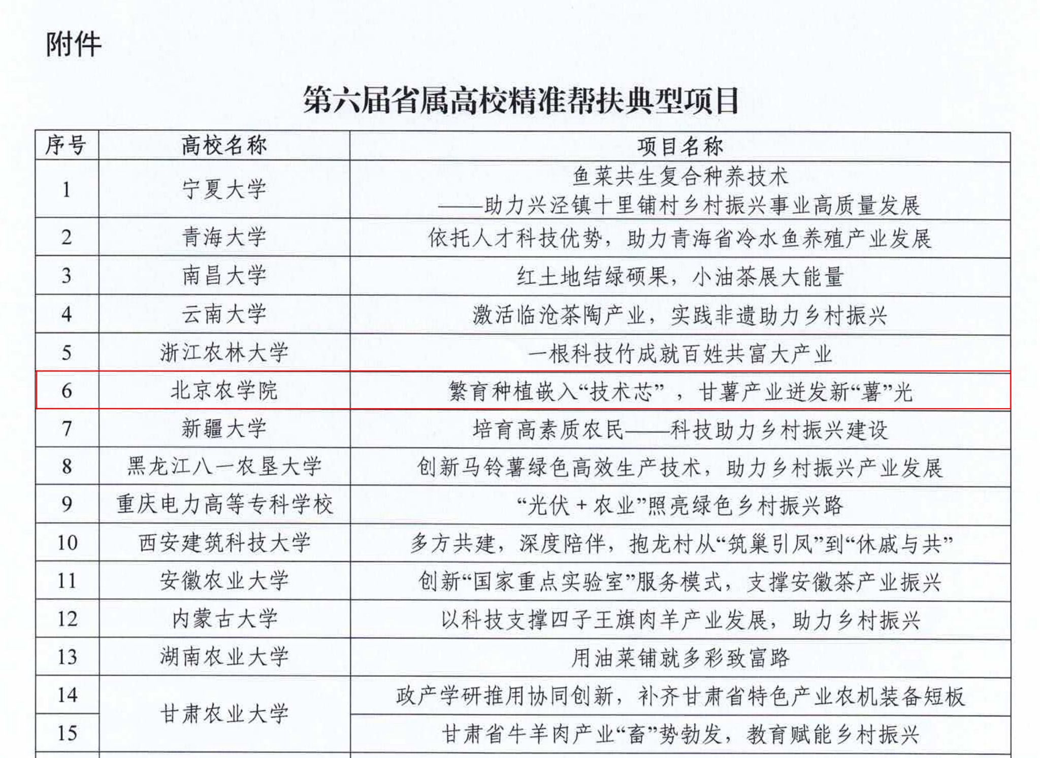 近日,教育部发展规划司公布了第六届省属高校精准帮扶典型项目推选结果,beat365中文官方网站报送的《繁育种植嵌入“技术芯” 甘薯产业迸发新“薯”光》成功入选。这是继beat365官网2021年报送的案例《发挥平台资源优势提升精准帮扶成色》、2022年报送的案例《科技特派员驻点数字平台发力提升精准帮扶成效》入选教育部省属高校精准帮扶典型项目之后,学校精准帮扶案例第三次入选该项目。beat365官网也是唯一一所连续三届入选省属高校精准帮扶典型项目的北京市属高校。