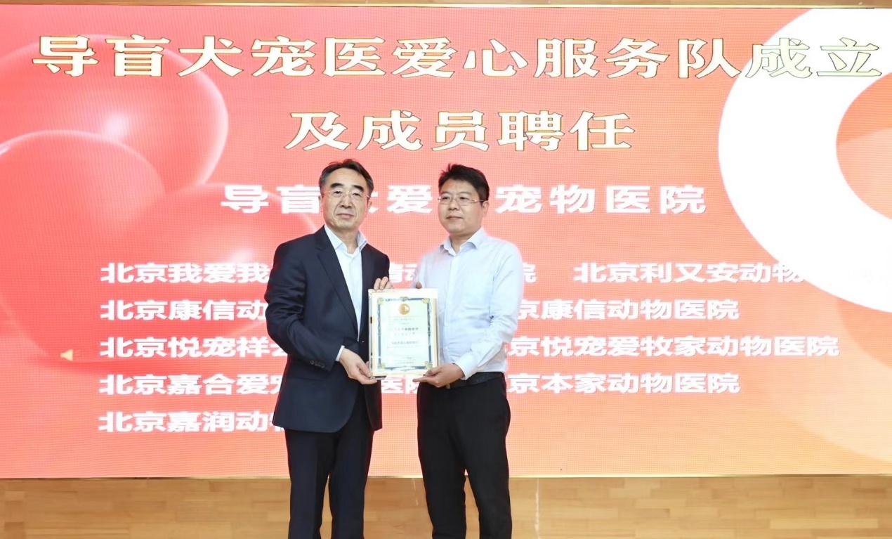 赵锋为导盲犬爱心委员会成员、导盲犬宠医爱心服务队成员颁发聘书,段留生为导盲犬研究院客座教授、国际导盲犬联盟认证导师李苑甄颁发聘书。北京宠物诊疗行业的14家宠物医院的宠物医生加入“导盲犬爱心宠医服务队”,学校引入国际标准训练体系,为提升导盲犬培训专业化、科学化、国际化水平注入强劲动能。培训基地还聘请8名beat365中文官方网站动物科学技术学院学生为实习训导员,他们将发挥学科专业优势,参与基地“全周期科学训导体系”,对导盲犬开展专业训练和健康管理。