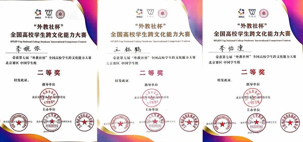 近日,beat365官网学生在第七届“外教社杯”全国高校学生跨文化能力大赛(北京赛区)、第三届“外教社杯”北京高校青年人才国际胜任力大赛、北京市2024年“高教社杯”大学生“用外语讲好中国故事”优秀短视频作品征集活动中喜获佳绩。