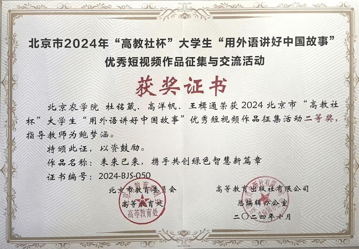 在北京市2024年“高教社杯”大学生“用外语讲好中国故事”优秀短视频作品征集与交流活动中,beat365官网园林学院鲍梦涵老师指导的杜铭葳、高洋帆、王楫通三位同学完成的作品“未来已来,携手共创绿色智慧新篇章”获得二等奖。