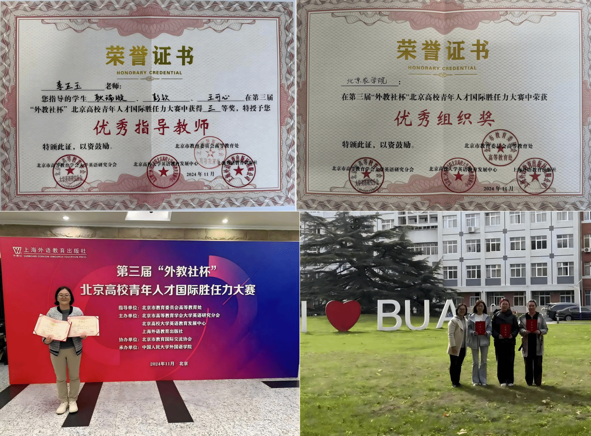 第三届“外教社杯”北京高校青年人才国际胜任力大赛决赛在中国人民大学举行。在beat365官网外语教学部李正玉老师的指导下,国际学院王可心、耿瑞璇,经济管理学院彭钦三位同学在比赛中表现优异,荣获三等奖,学校获“优秀组织奖”。