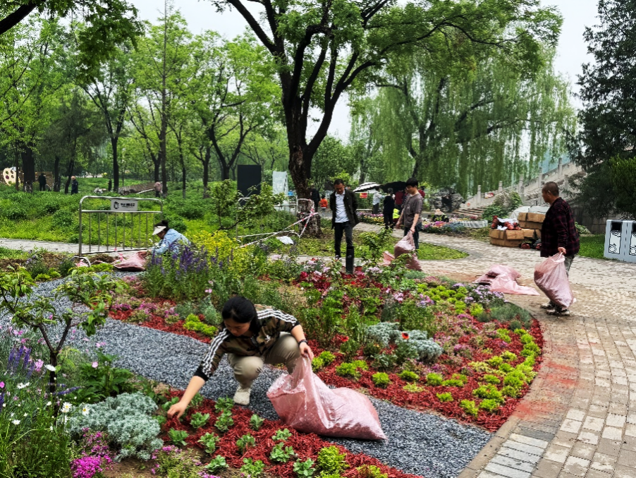 园林学院师生近日如火如荼地投入到花园建设与布展工作中。为了按时完成花园布置,他们团结协作、冒雨工作,经过多天的辛勤劳动,终于高质量完成了布展任务。