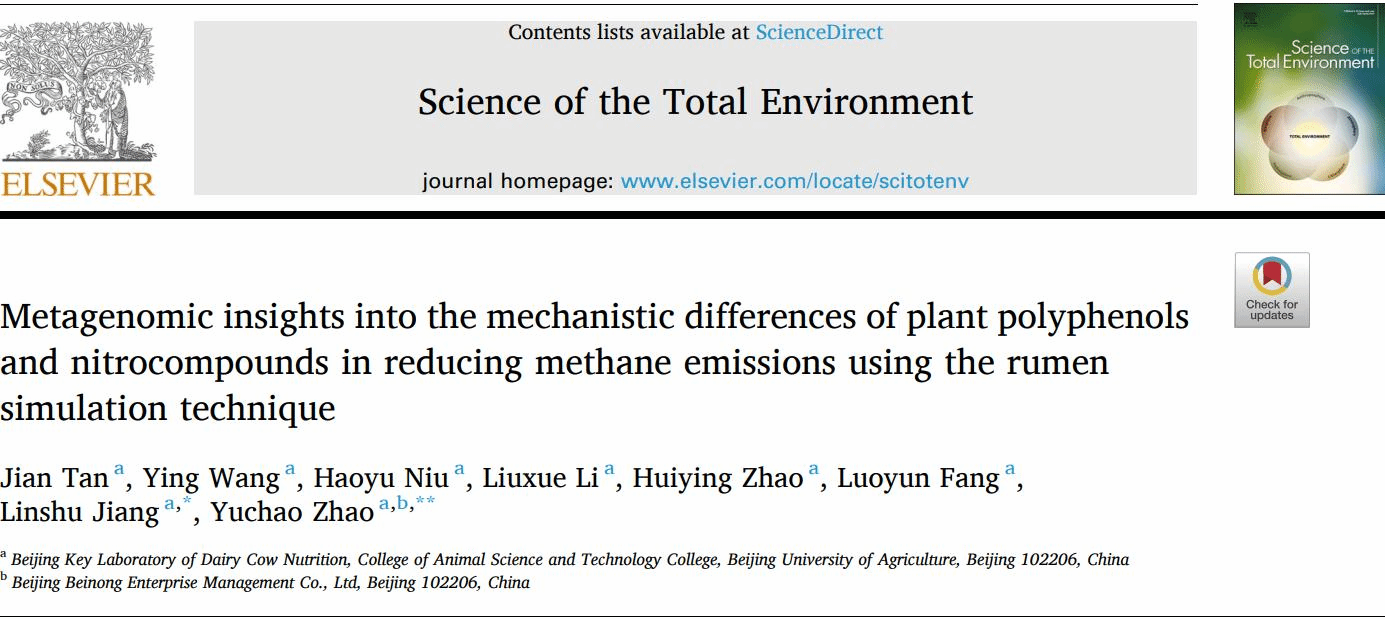 谭健为第一作者、赵玉超与蒋林树为共同通讯作者发表的另一篇关于植物多酚和硝基化合物在减少反刍动物甲烷排放中作用机制的论文为《Metagenomic insights into the mechanistic differences of plant polyphenols and nitrocompounds in reducing methane emissions using the rumen simulation technique》。该研究利用体外模拟瘤胃发酵技术,从微生物组学角度揭示了不同添加剂在降低瘤胃甲烷排放中的具体作用路径,为畜牧业绿色生产提供了科学依据。