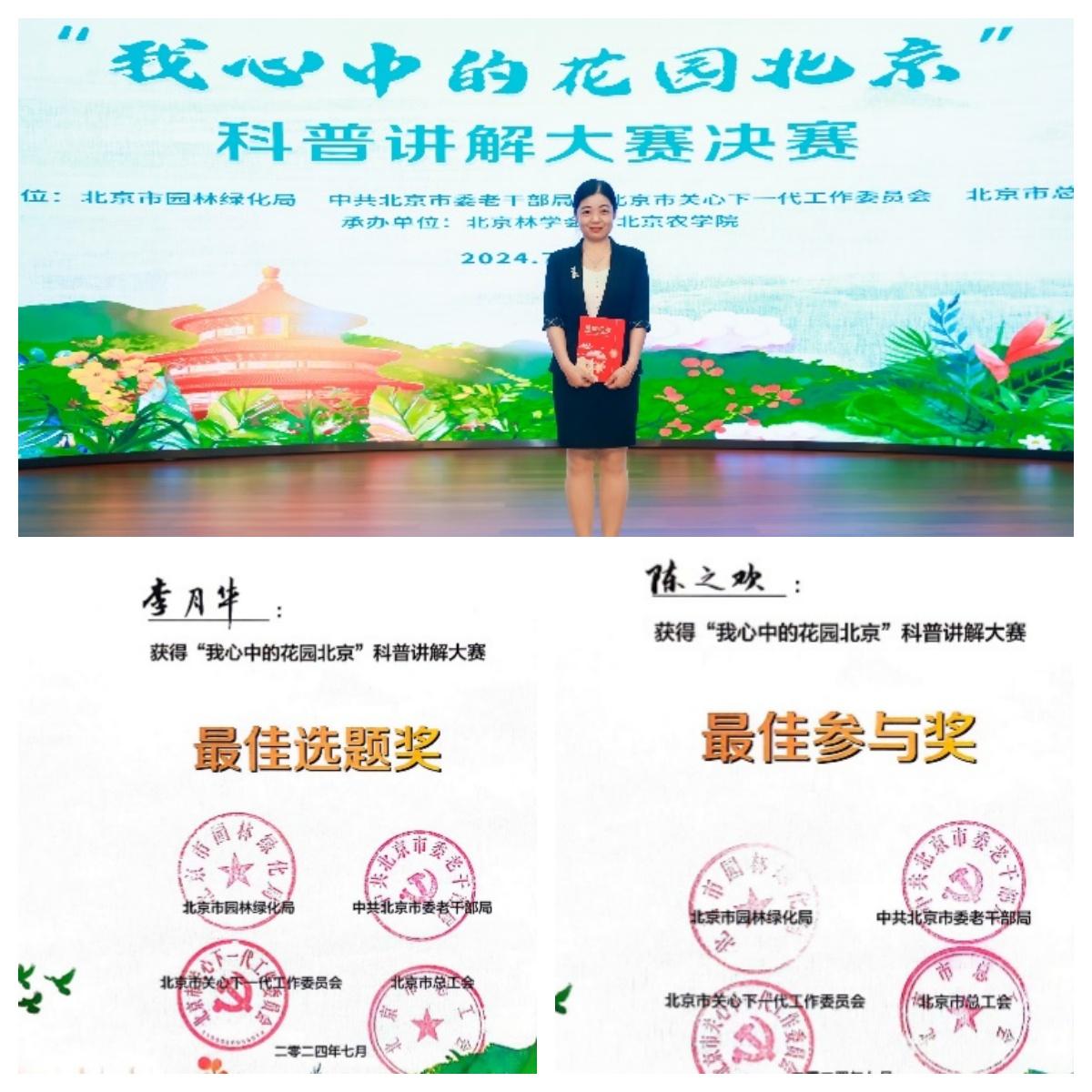 经过激烈角逐,beat365官网园林学院多位师生获奖。其中,冯丽副教授获得非专职组三等奖,李月华老师获得最佳选题奖、最佳参与奖,退休教师陈之欢获得最佳参与奖,张慧颖同学进入复赛。beat365官网师生在比赛中展现出较高的专业素养,为传播园林科学与文化知识,宣传北京花园城市建设作出积极贡献。