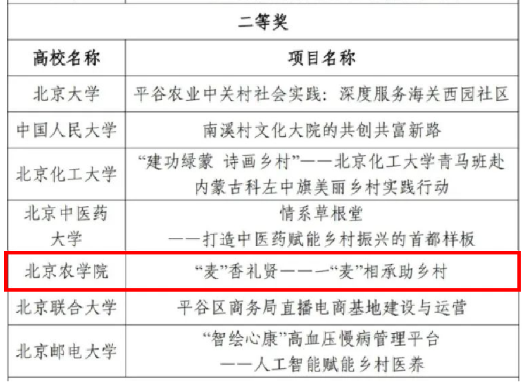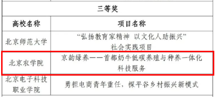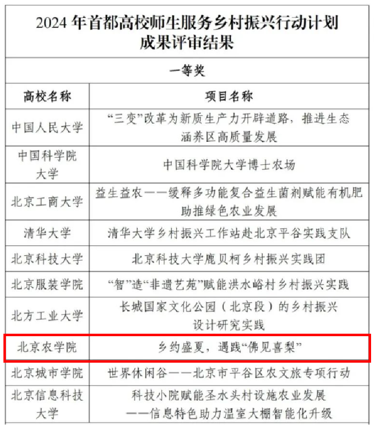 日前,由北京市委教育工委、市教委组织的2024年首都高校师生服务乡村振兴行动计划成果评审结果正式公布,共评选出一等奖10项、二等奖20项、三等奖30项、优秀奖39项。beat365官网生物与资源环境学院“乡约盛夏,遇践‘佛见喜梨’”团队荣获一等奖,食品科学与工程学院“‘麦’香礼贤——一‘麦’相承助乡村”团队荣获二等奖,动物科学技术学院“京韵绿养——首都奶牛低碳养殖与种养一体化科技服务”团队荣获三等奖。