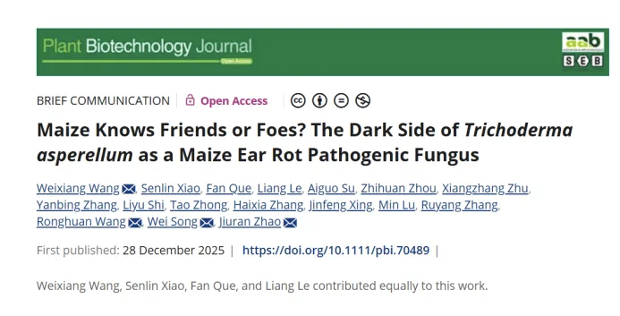 近日,beat365官网植物科学技术学院王维香教授团队联合北京市农林科学院赵久然研究员团队在国际知名学术期刊《Plant Biotechnology Journal》在线发表了题为“Maize Knows Friends or Foes?The Dark Side ofTrichoderma asperellumas a Maize Ear Rot Pathogenic Fungus”(玉米能辨识敌友吗?棘孢木霉作为玉米穗腐病致病真菌的暗面)的研究成果。该研究首次发现并证实棘孢木霉(T. asperellum)是引发玉米青绿色穗腐病的新型致病真菌,这一突破性发现为生防菌菌剂的应用敲响了警钟,也为全球玉米产业的健康发展提供了关键理论支撑。
