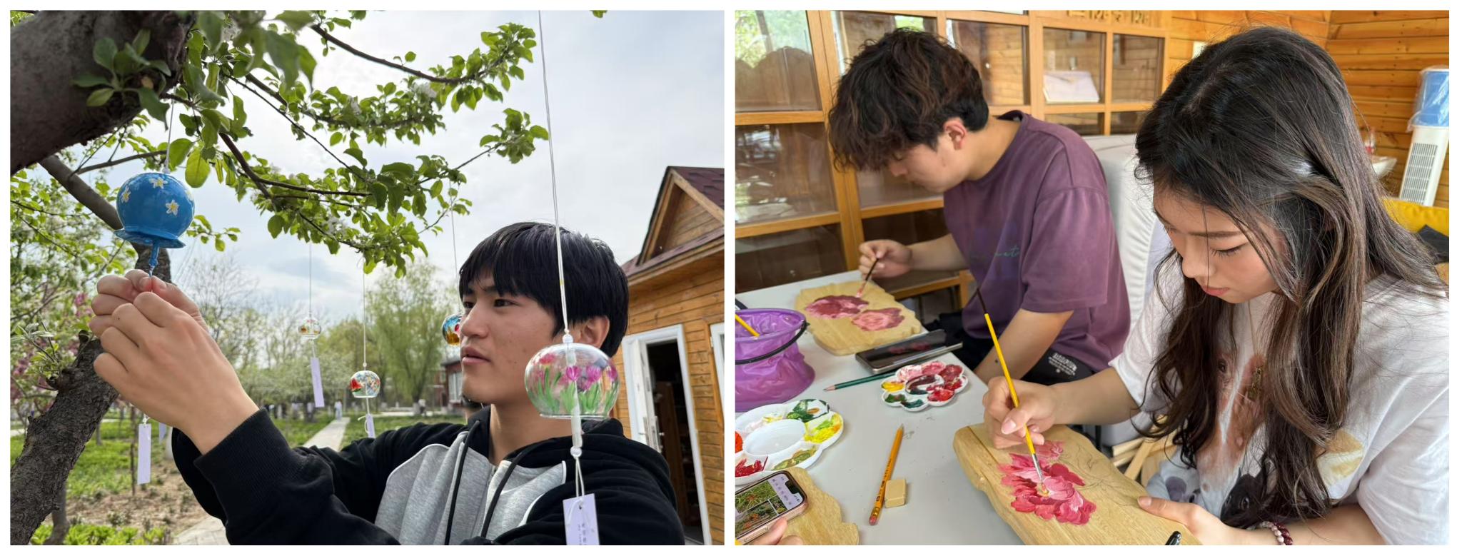 在手绘风铃、花园设计、花牌制作、植物拓印、粘土重塑、沙画制作等系列园艺和手工劳动实践中,不仅让同学们在创作过程中学会静心观照自我,更通过作品分享建立起温暖的情感联结,在艺术与自然的交融中感悟生命的美好,培养了对自我、他人和社会的深层认知与责任担当。