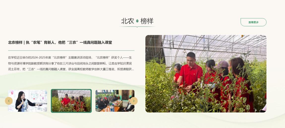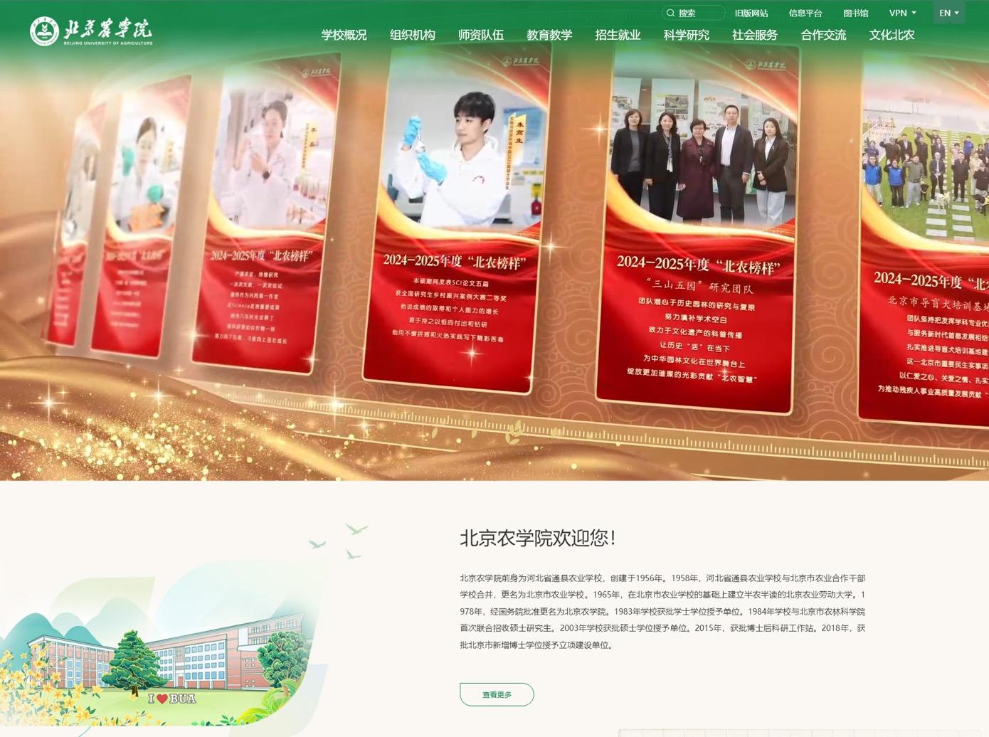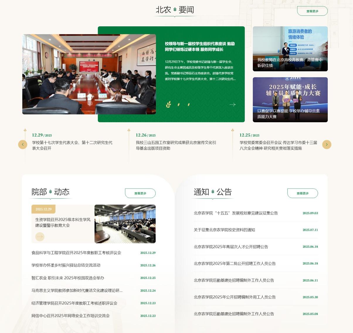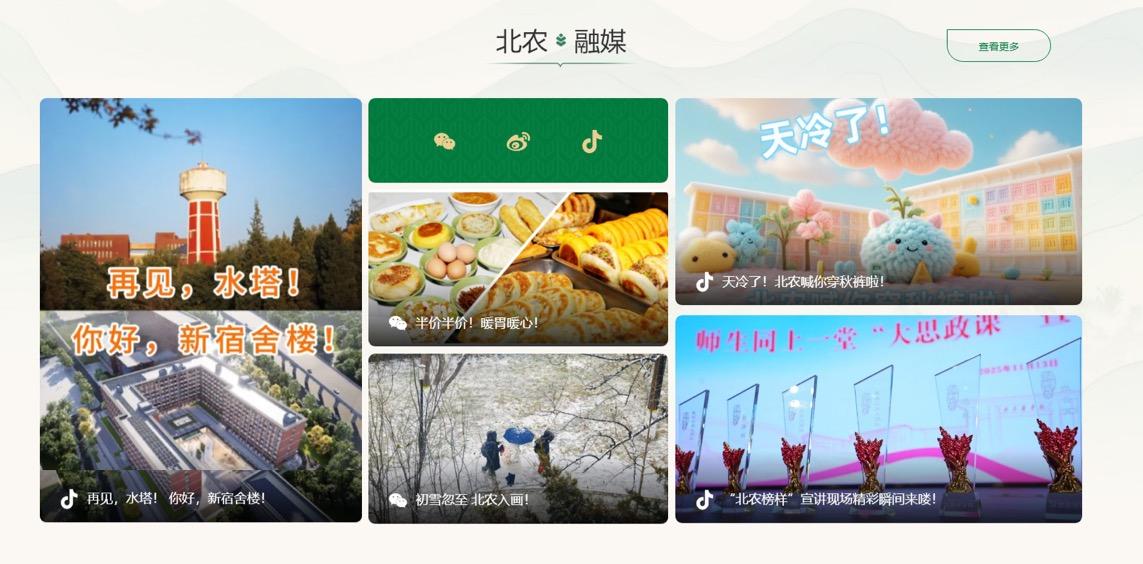 新版官网主页在核心位置呈现“北农新闻”“院部动态”“学术报告”“媒体视听”“专题聚焦”“文化北农”等重要新闻资讯;将麦穗、书本、校园建筑等元素融入界面设计,体现农业院校特色;在首页上部最醒目的区域,以图片、短视频的形式生动展现学校重要活动及校园风貌;新增“北农榜样”板块,旗帜鲜明树正气树榜样树典型,新增“北农融媒”板块,可一键直达学校官方微信公众号、官方抖音号、官方视频号等新媒体平台,不断推进媒体融合。