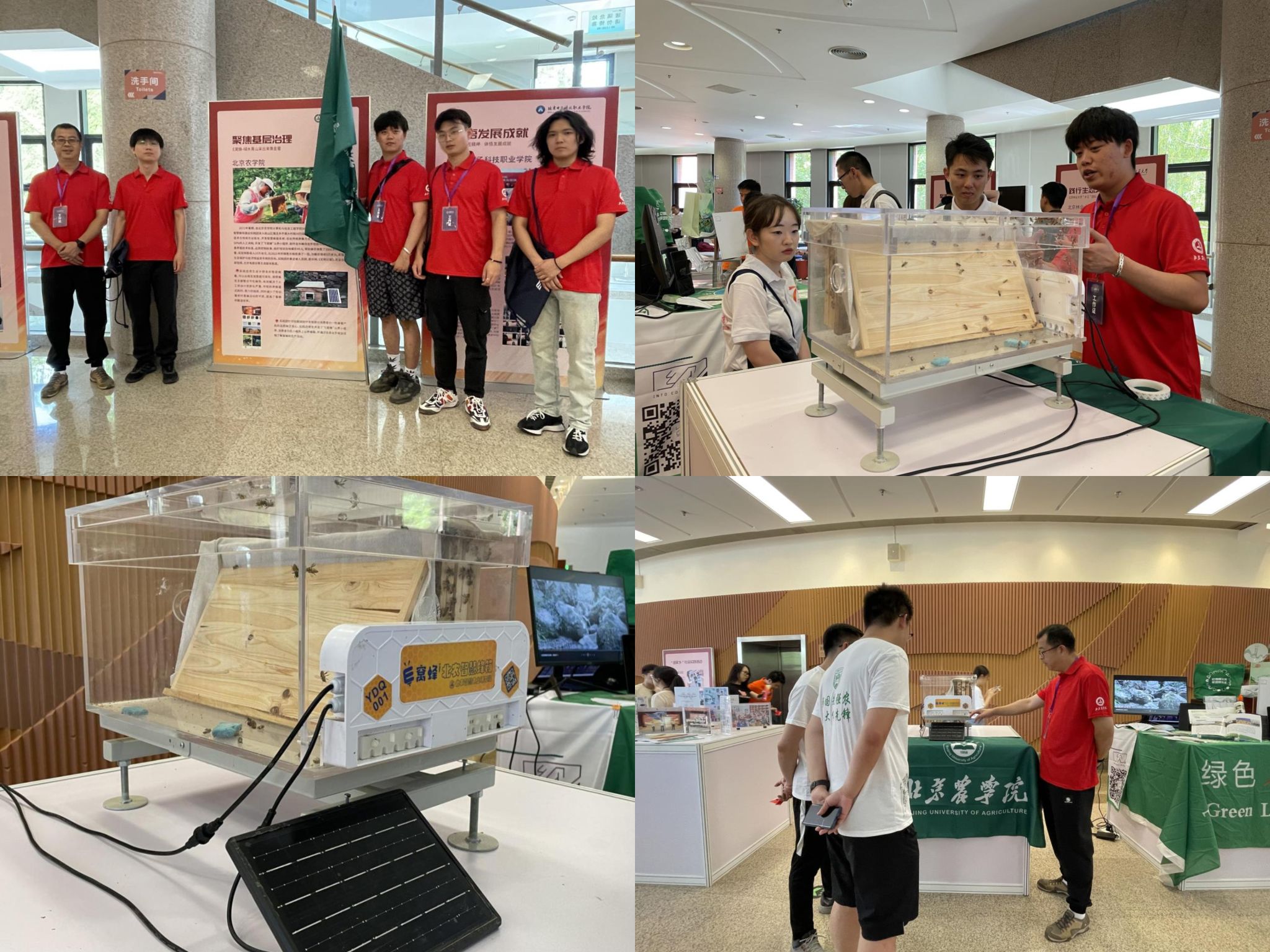 在活动现场的展览展示区,beat365官网计算机与信息工程学院的“E窝蜂”-蒲洼乡智慧蜂场建设实践团代表学校展示了设计开发的智能蜂箱,该蜂箱能够远程可视化数据处理,从而使蜂农无需长时间在蜂场工作,有效地解决了人工劳动力严重老龄化和传统养蜂模式费时费力等问题,同时还能降低劳动量、避免过多干扰蜜蜂活动、提高蜜蜂酿造效率,展示过程吸引了很多参会师生。