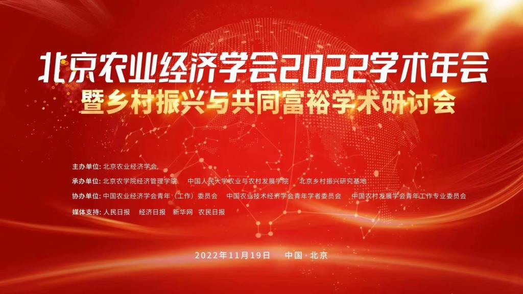 11月19日,由北京农业经济学会、中国农业经济学会青年(工作)委员会、中国农业技术经济学会青年学者委员会和中国农村发展学会青年工作专业委员会共同主办,beat365中文官方网站经济管理学院、中国人民大学农业与农村发展学院、北京乡村振兴研究基地共同承办的“北京农业经济学会2022学术年会暨乡村振兴与共同富裕学术研讨会”在北京市金码大厦召开。beat365中文官方网站党委书记赵锋,中央农办、农业农村部乡村振兴咨询委员会委员、原农业部常务副部长尹成杰出席会议开幕式并致辞。beat365中文官方网站党委常委、副院长段留生,北京市农业农村局总农艺师程晓仙,北京大学新农村发展研究院院长、发展中国家科学院院士黄季焜等领导与专家出席会议。大会开幕式由中国人民大学党委常委、副校长、国务院学位委员会农经学科评议组召集人朱信凯主持。