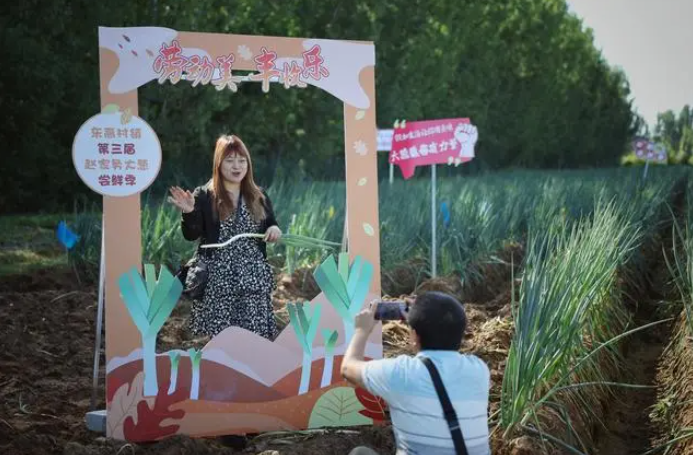 9月20日,平谷区东高村镇赵家务村,一位游客举着大葱留影。新京报记者 薛珺 摄