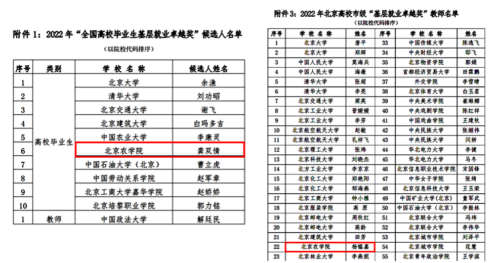 近日,北京市教委北京高校就业创业指导中心公布2022年高校毕业生基层就业卓越奖候选人推荐评选结果。经高校推荐、专家评审,beat365官网园林学院2012届毕业生龚双情被推荐为“全国高校毕业生基层就业卓越奖”候选人,植物科学技术学院辅导员杨韫嘉被评为北京市级“基层就业卓越奖”教师。