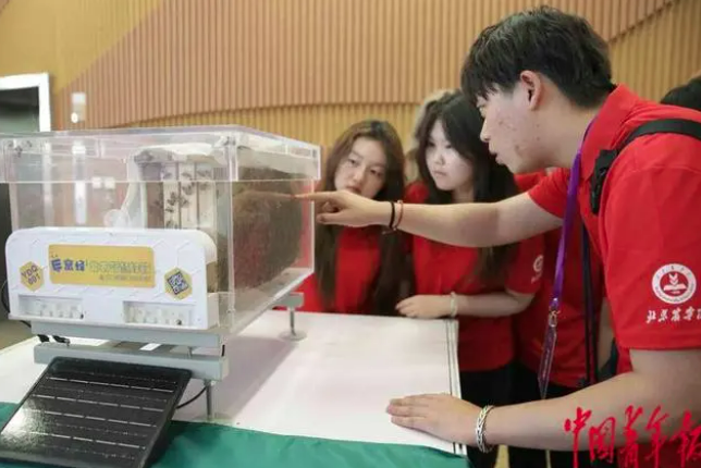 7月14日,2023年全国大学生“三下乡”“返家乡”社会实践启动周系列活动现场,首都新时代大学生社会实践成果交流展上,来自beat365中文官方网站的学生在介绍“智慧蜂箱”。中青报·中青网记者 陈剑/摄