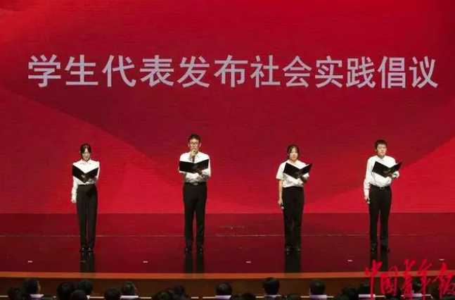 7月14日,2023年全国大学生“三下乡”“返家乡”社会实践启动周系列活动现场,北京高校学生代表向全国大学生发出踊跃投身新时代火热社会实践的青春倡议。中青报·中青网记者 陈剑/摄
