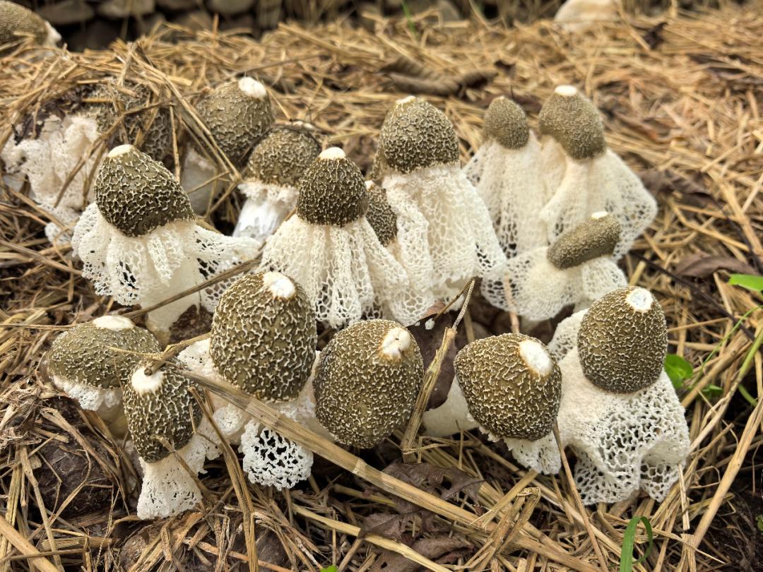 在昌平区流村镇谷氏农业专业合作社林下食用菌种植区,实践团重点考察了竹荪采收现状。得益于前期精准的水分调控和绿色防控措施,采用稻草覆盖技术的竹荪生长稳健、陆续开伞,目前正值最佳采收期。“采收时要特别注意保持竹荪形态完整和色泽洁白,这样才能保证商品价值。”指导教师张国庆教授现场示范了长裙竹荪采收的注意事项,强调要把握最佳采收时机,确保产品品质。