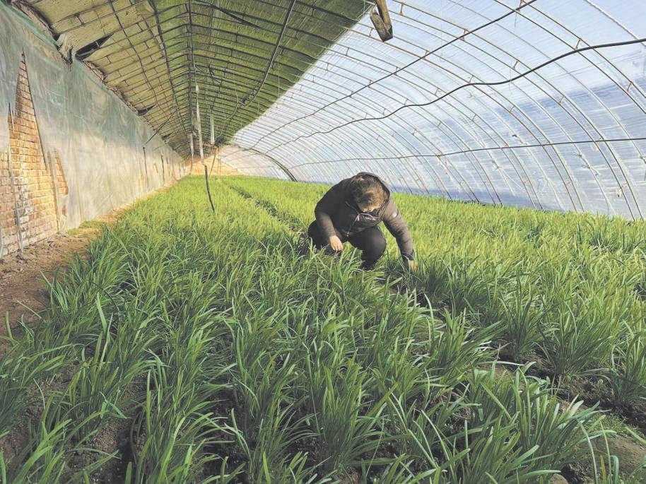 苍上村第一书记马金娜查看韭菜长势。