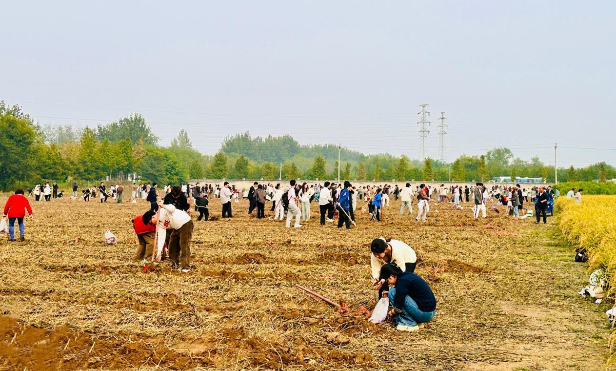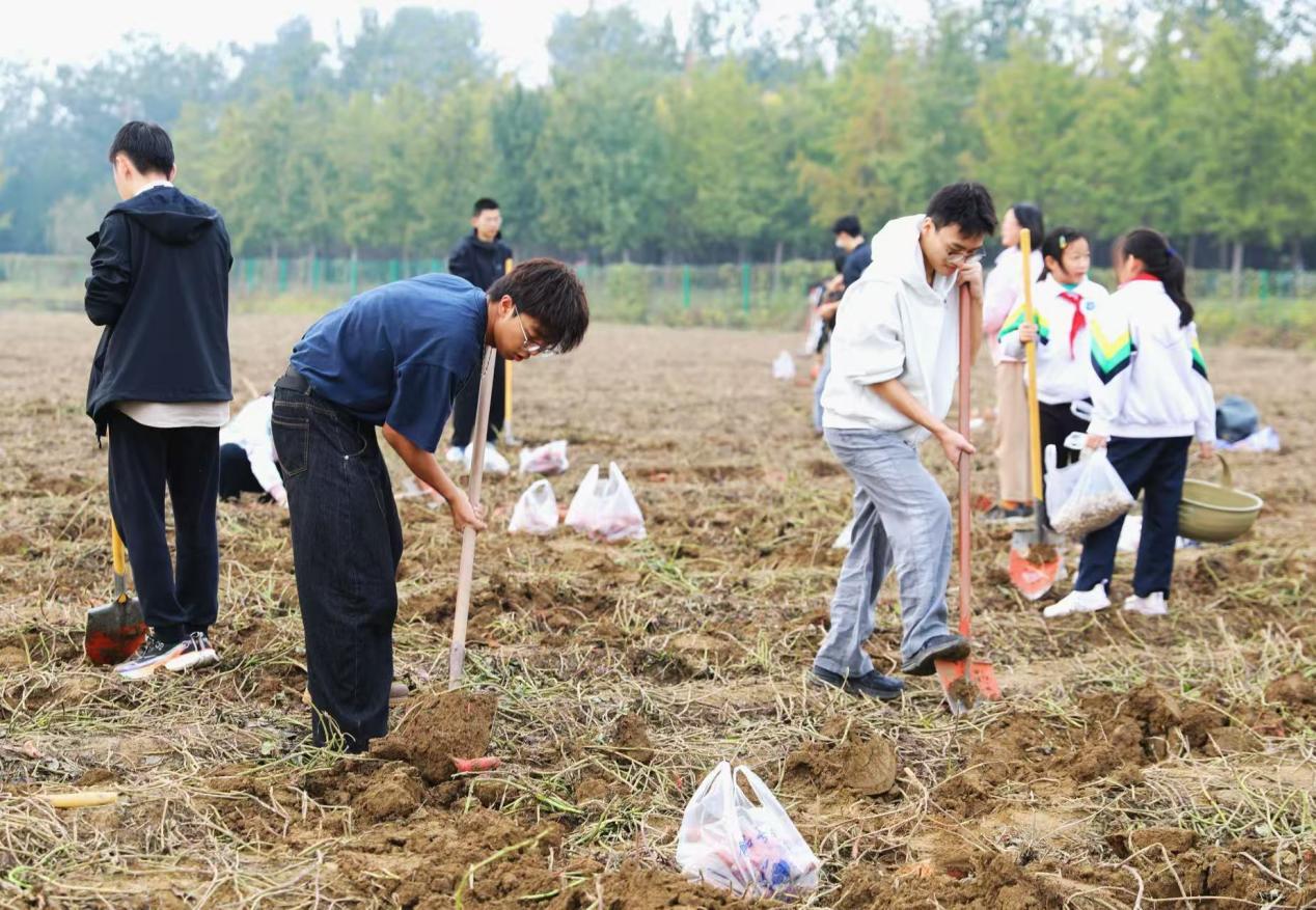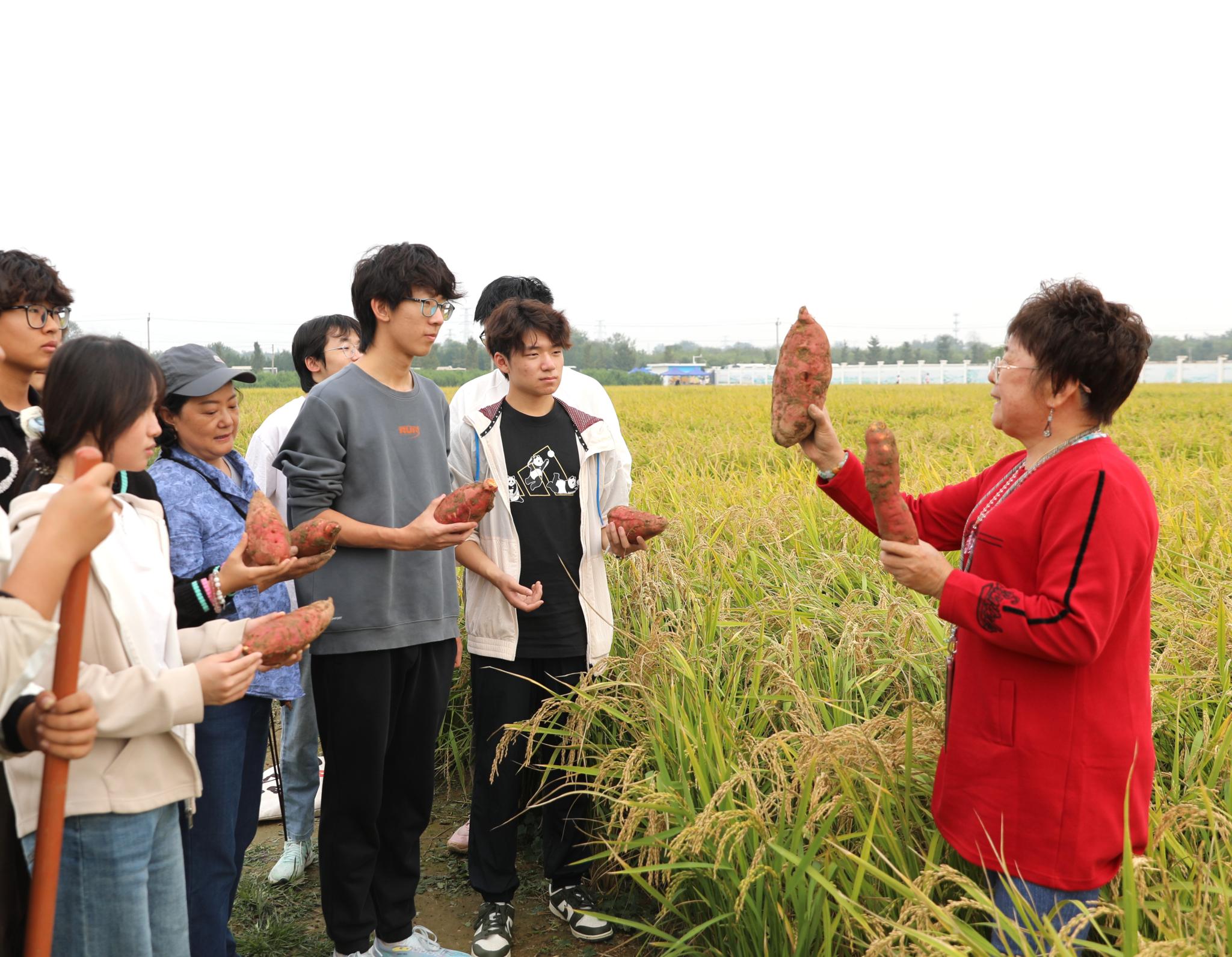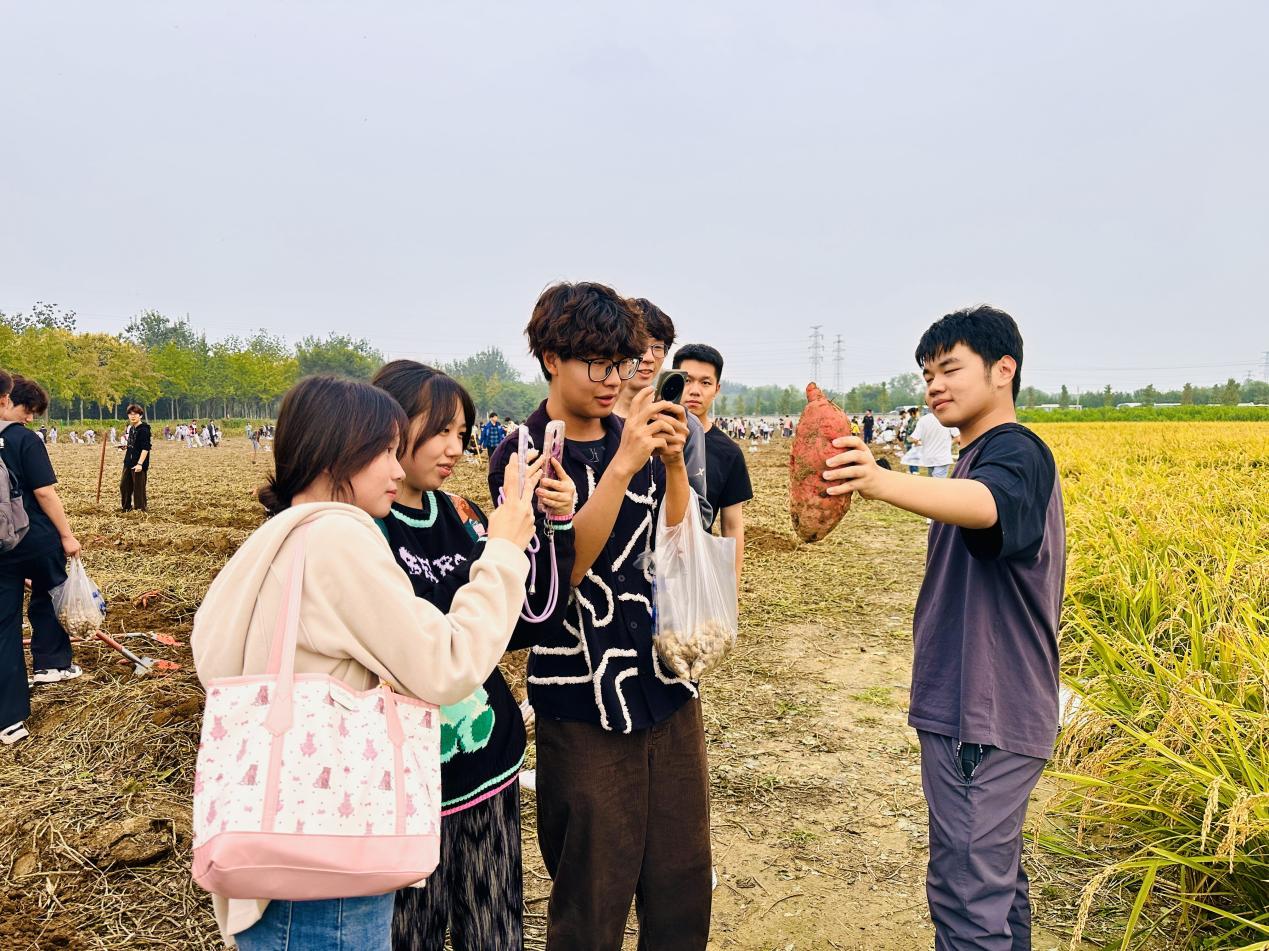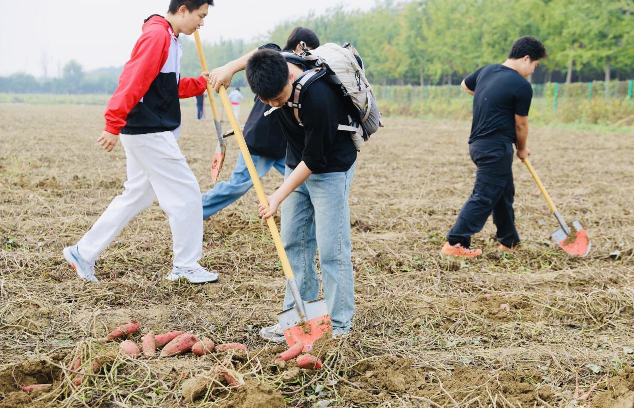 在一旁的红薯田里,来自北京大学、北京科技大学和北京体育大学的师生们,正俯身进行着一场细致的“地下寻宝”。“先找到红薯的根,红薯的‘家’通常安在根系周围10~15厘米的土层里,从四周将铁锹沉稳发力向下深掘,再顺势一撬,就能顺利挖出红薯了。”按照老师所授,同学们开始行动起来。当橙红饱满的红薯挣脱了泥土的怀抱,完整地呈现在眼前,“哇!”不少同学发出惊喜的赞叹声。