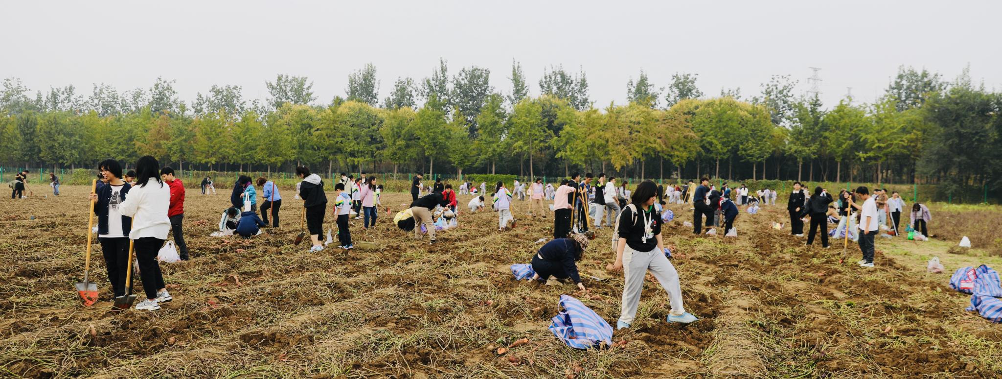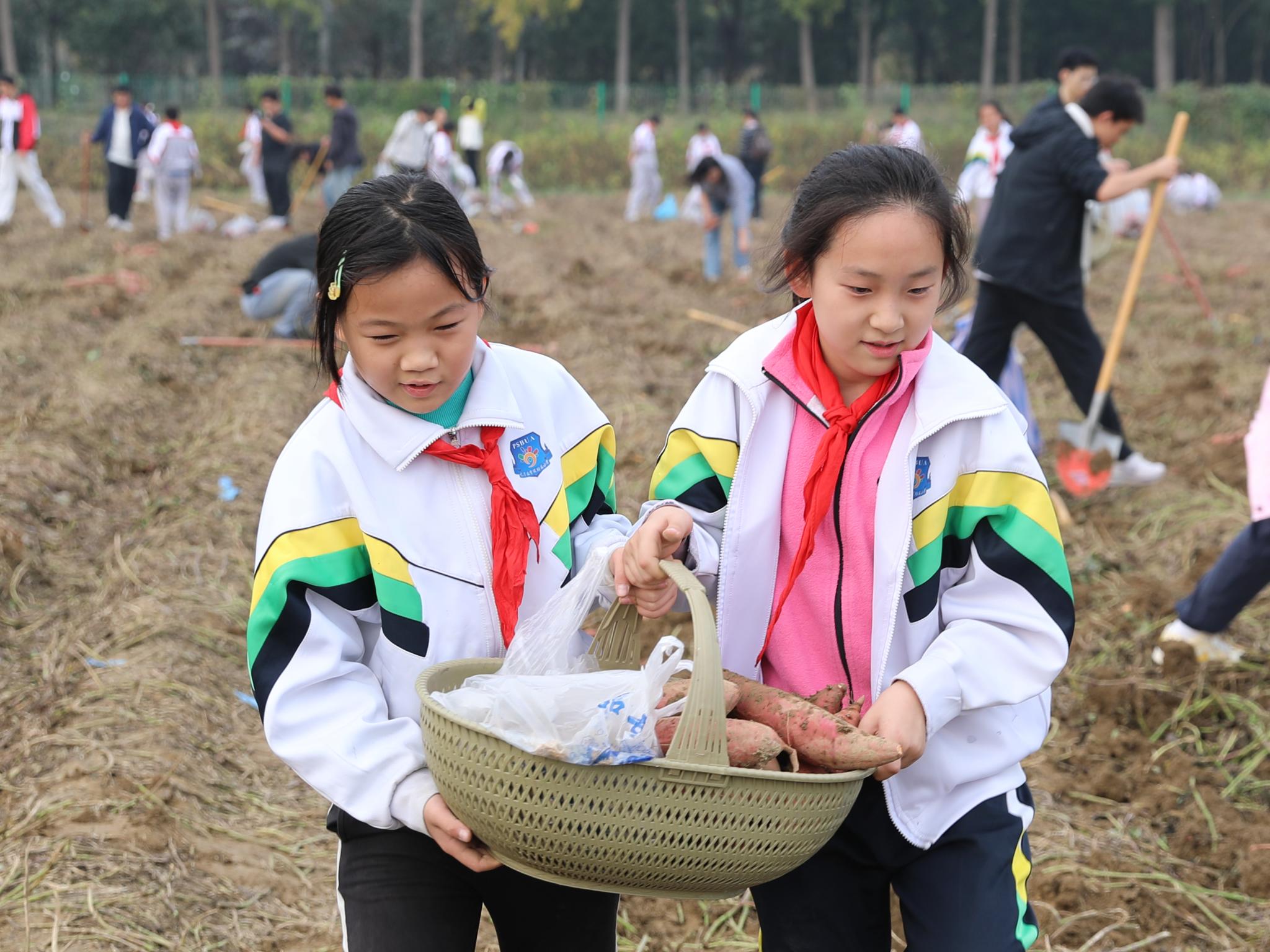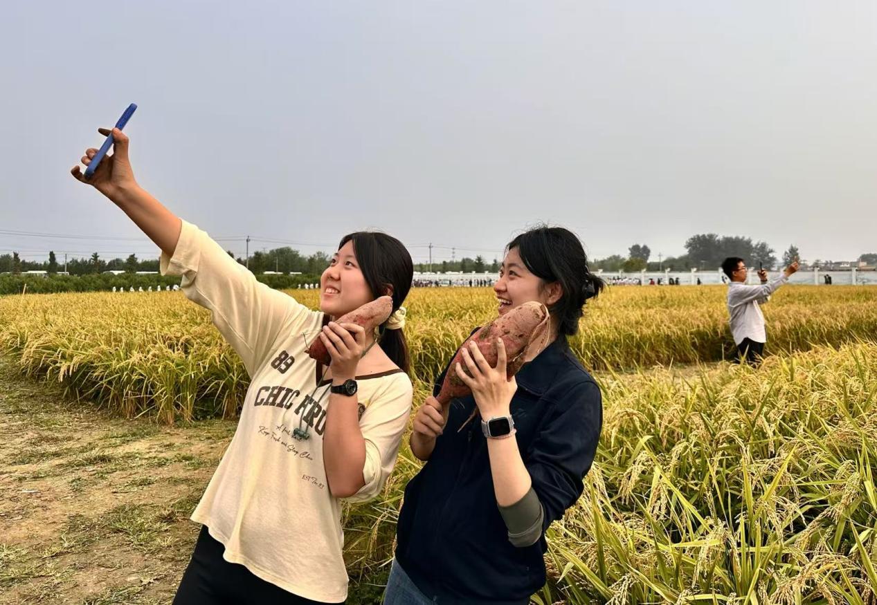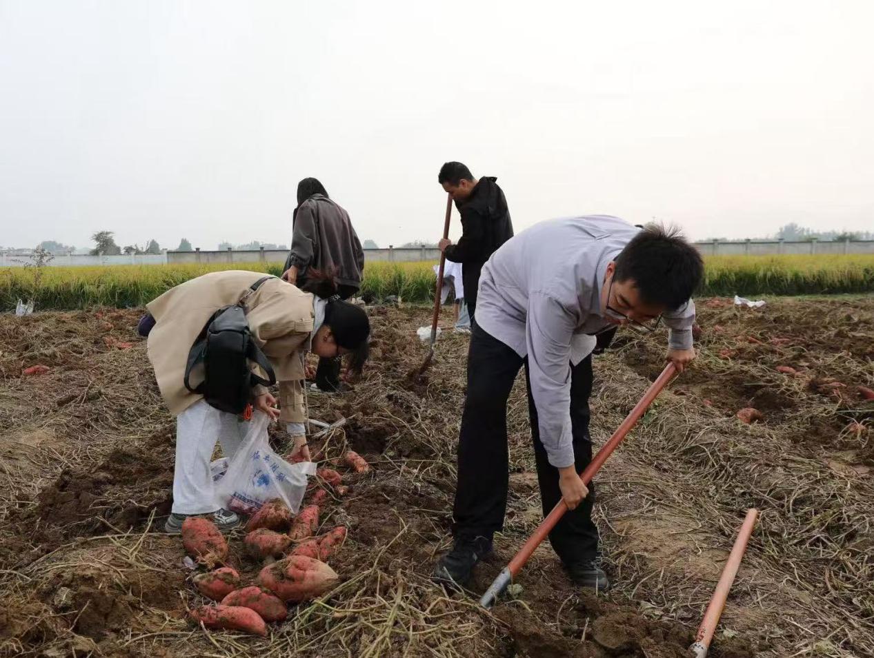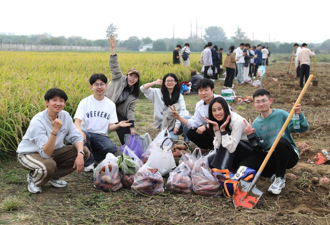 在一旁的红薯田里,来自北京大学、北京科技大学和北京体育大学的师生们,正俯身进行着一场细致的“地下寻宝”。“先找到红薯的根,红薯的‘家’通常安在根系周围10~15厘米的土层里,从四周将铁锹沉稳发力向下深掘,再顺势一撬,就能顺利挖出红薯了。”按照老师所授,同学们开始行动起来。当橙红饱满的红薯挣脱了泥土的怀抱,完整地呈现在眼前,“哇!”不少同学发出惊喜的赞叹声。