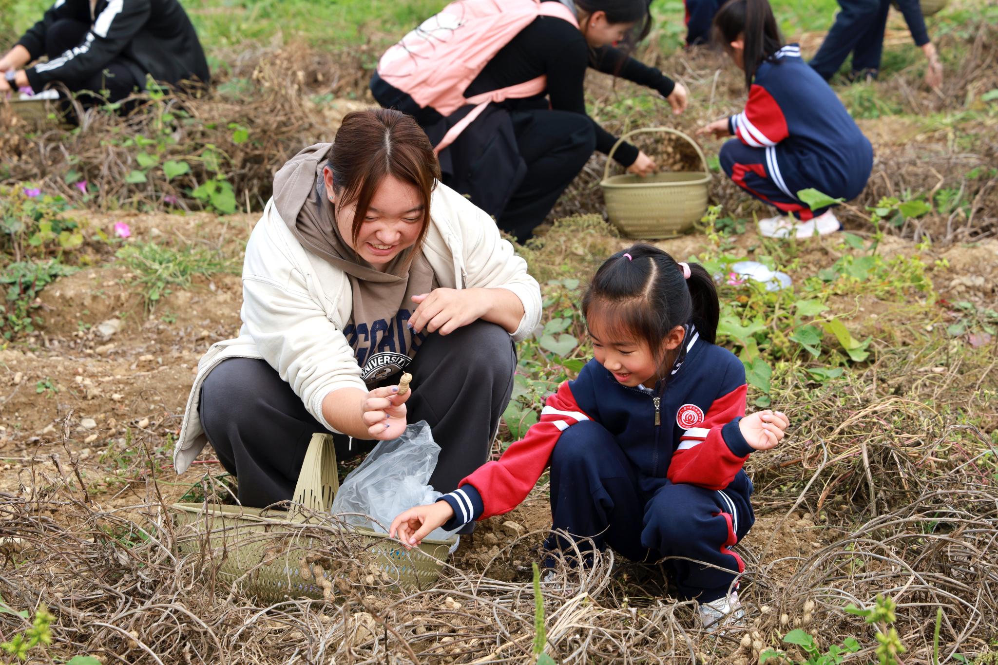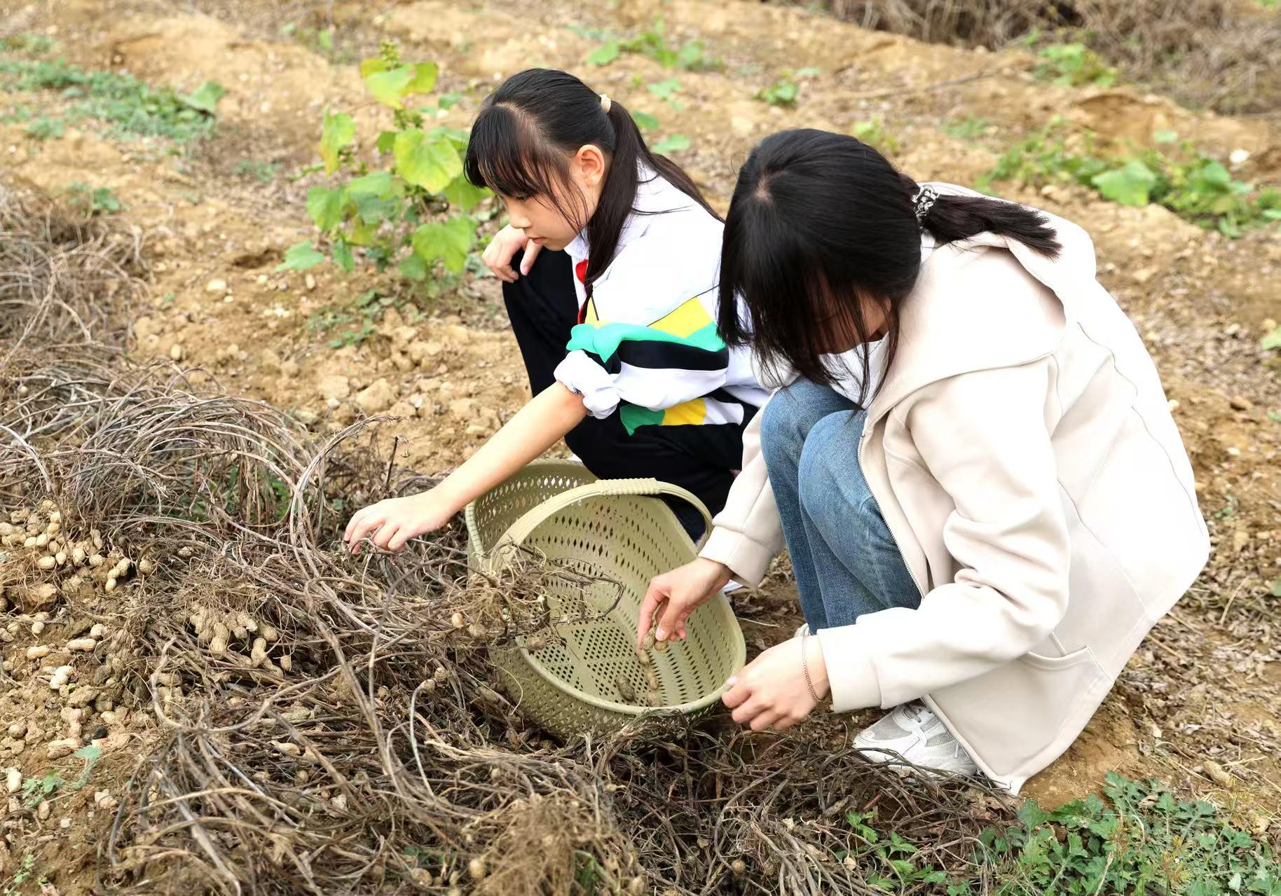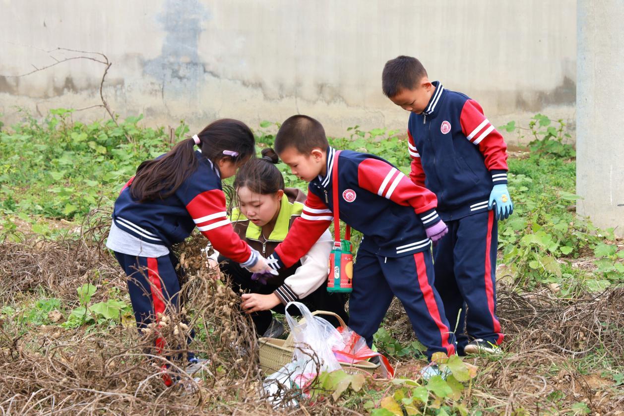同学们小心拨开花生秧,在秧苗根部松土,并以均匀的力道向上提起,伴随着“窸窸窣窣”的泥土脱落声,整墩花生被拔了出来。当沾满泥土的双手捧起沉甸甸的收获,洋溢在同学们脸上的是纯粹的欣喜与满足。