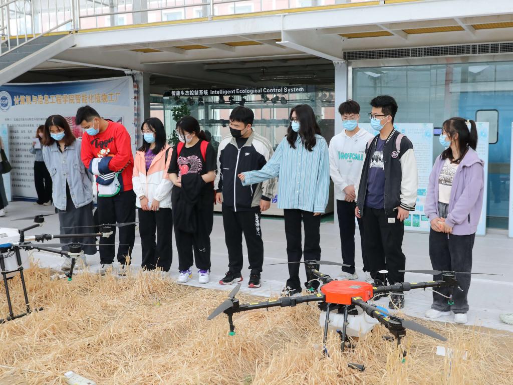 在智慧农业实验温室内,水质监测系统、智慧蜂箱、植保无人机、智能无人拖拉机、五合一新型太阳能传感器、智慧农业控制终端、智能植物生理检测仪、智慧农业卷膜通风控制器等智慧农业科技成果引起同学们赞叹,大家直观深入地感受到现代农业和智慧农业的魅力。