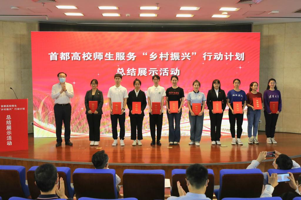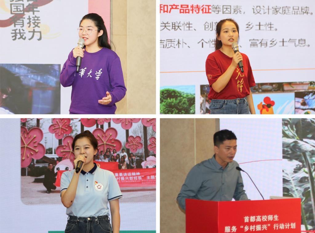 会上,与会人员共同观看了首都高校师生服务“乡村振兴”行动计划宣传片《青春绽放在希望的田野上》;清华大学“乡村振兴工作站山东济宁”实践团、中国人民大学“艺术振兴乡村服务在葛家”实践团、中国农业大学“以3R垂直植物速生技术赋能乡村振兴”实践团、北京城市学院“乡村振兴 科技助农”实践团的负责同志和师生代表,分享了他们奔赴“三农一线”服务乡村振兴的典型事迹和实践成果。