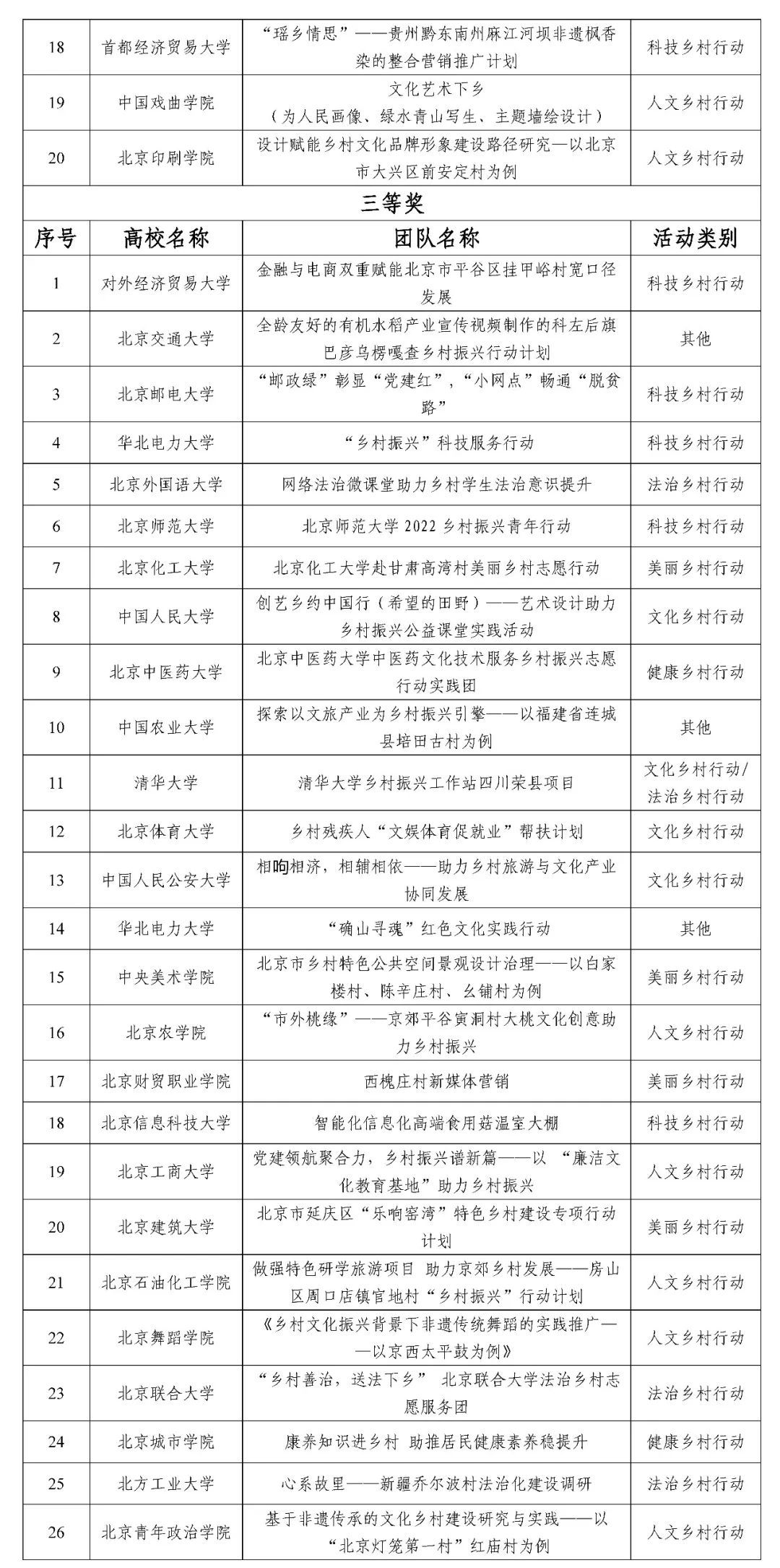 今年6月,市委教育工委、市教委启动首都高校师生服务“乡村振兴”行动计划,遴选优秀团队,奔赴全国22个省、市、自治区的119个乡村开展实践,助力乡村发展,取得显著效果。为进一步凝练经验、激励先进,经高校推荐、专家评审,共评选一等奖10项、二等奖20项、三等奖30项、优秀奖38项,现将获奖名单予以公布。