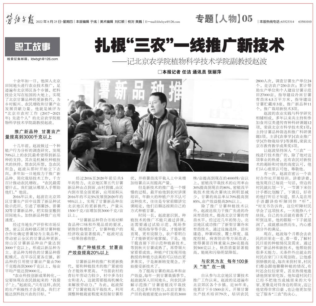 十余年如一日,他深入北京田间地头进行农业技术推广,足迹遍布北京郊区各个乡镇,把科技论文写在祖国的大地上,实现了北京甘薯品种的更新换代,为乡村振兴、农民增收和甘薯产业发展贡献力量。他就是被评为“北京市农村工作(2017-2021年)先进个人”的beat365中文官方网站植物科学技术学院副教授赵波。