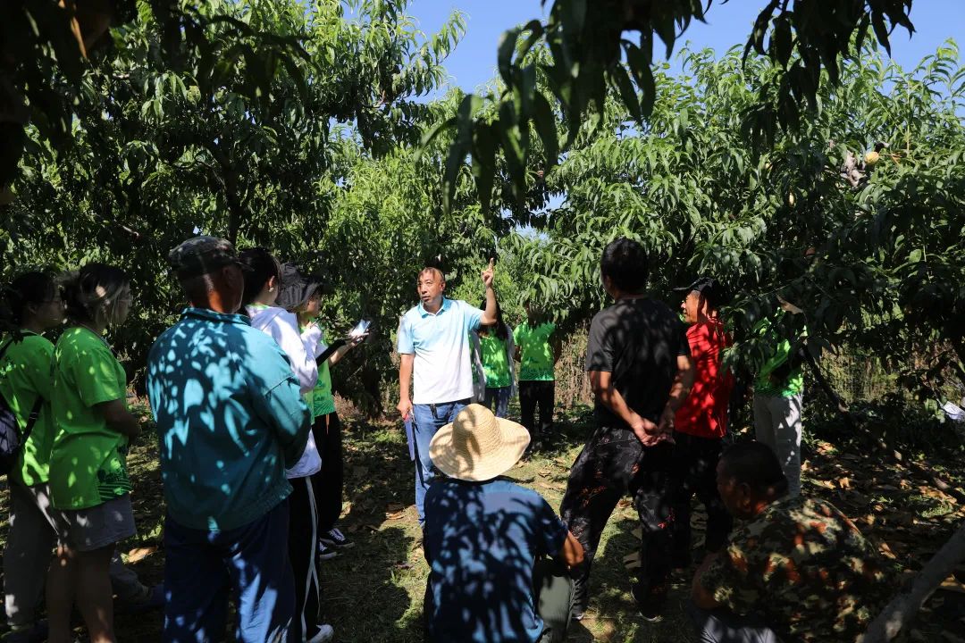 生物与资源环境学院教师刘悦萍带领暑期实践团先后到大华山镇后北宫村、刘家店镇胡店村桃树种植基地。在桃园里,刘悦萍与果农深度交流桃树生长过程中病虫害的生物防治问题、大桃品质问题。同时,在桃园里为学生们上起了课。