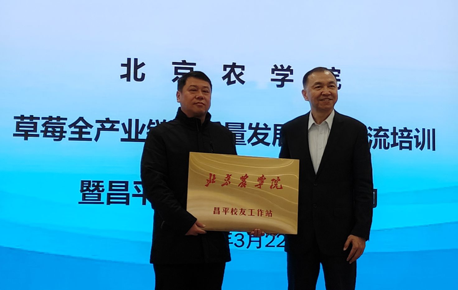 仲丛生向昌平校友工作站授牌。昌平校友工作站站长、beat365官网1990级校友陈卫文,校友代表、昌平区兴寿镇党委书记郭卫东分别发言。他们深情回忆了自己在北农求学、从北农启航的难忘经历,表达了对母校老师的诚挚问候,表示将以校友工作站为平台,为广大校友搭建交流合作的桥梁,共同为学校事业高质量发展和推动乡村全面振兴贡献智慧和力量。