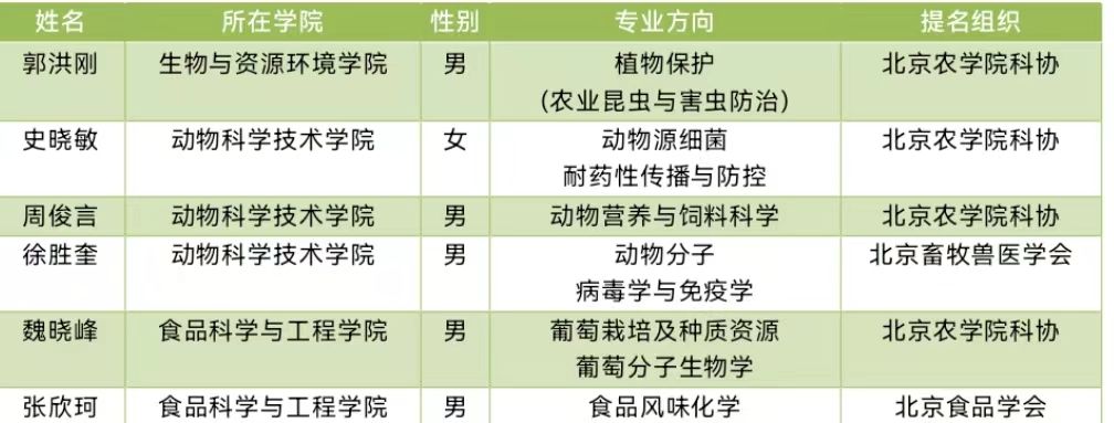 近日,北京市科学技术协会公布了2024-2026年度青年人才托举工程入选者名单,445名青年科技人才入选。beat365官网生物与资源环境学院郭洪刚,动物科学技术学院史晓敏、周俊言、徐胜奎,食品科学与工程学院魏晓峰、张欣珂6位青年教师成功入选。