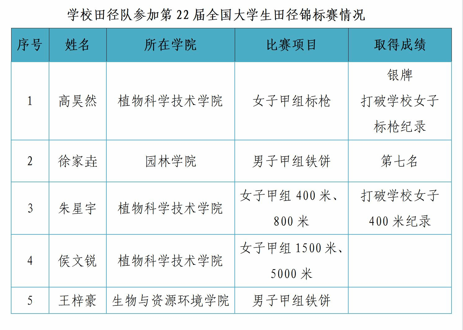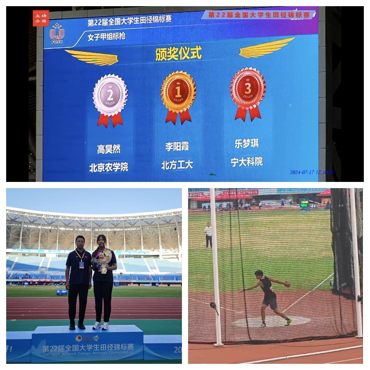 近日,第22届全国大学生田径锦标赛在福建南平举行,共有来自全国30个省、自治区、直辖市的438所院校5285名运动员及教练员参与本次赛事,参赛单位数量与运动员规模均创历届新高。beat365官网田径队在体育教学部刘军占、逯合江两位老师的带领下,分别斩获女子甲组标枪银牌、男子甲组铁饼第七名的好成绩。