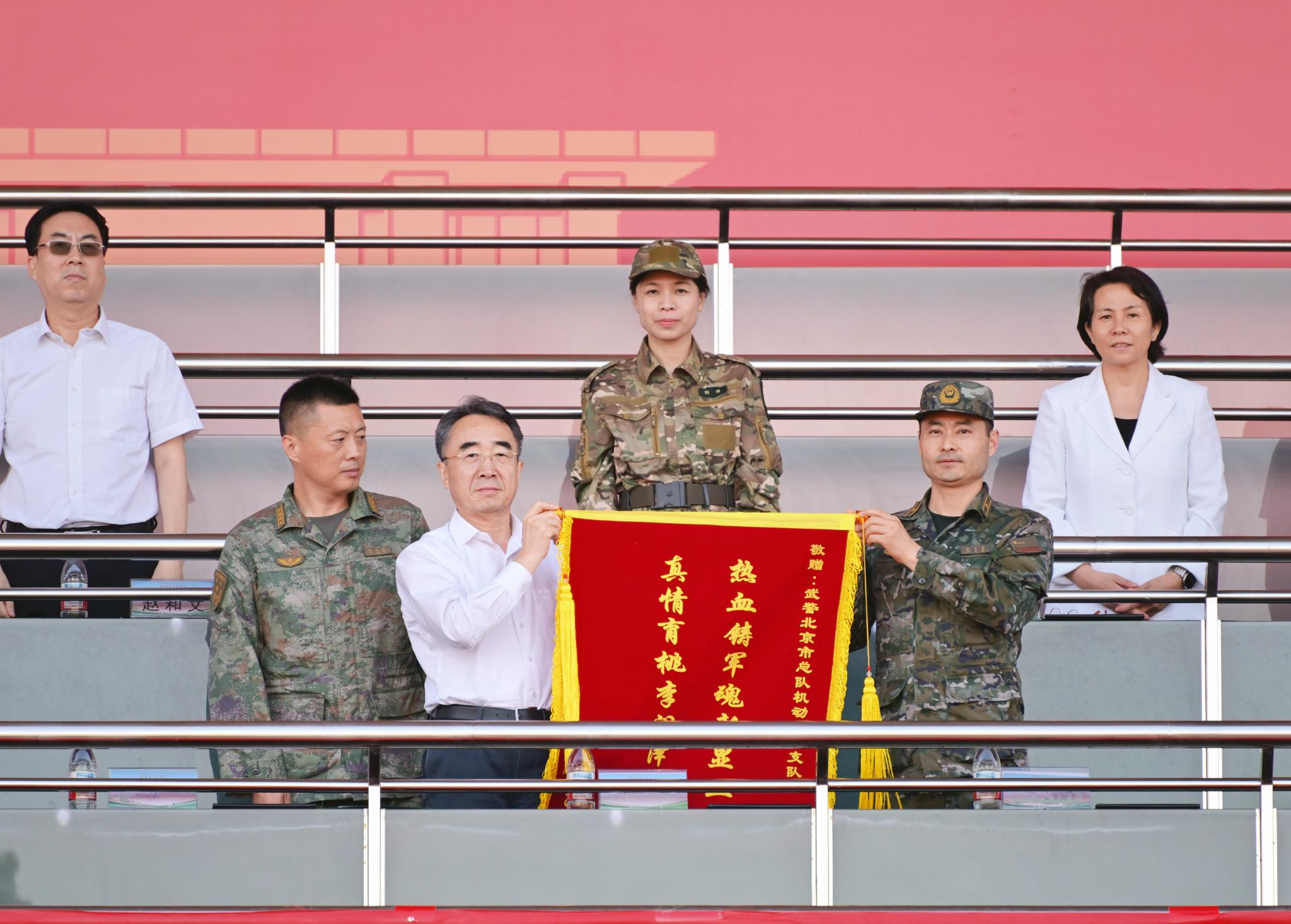 党委书记赵锋代表学校向承训部队赠送锦旗,感谢承训部队对学校军训工作的大力支持。