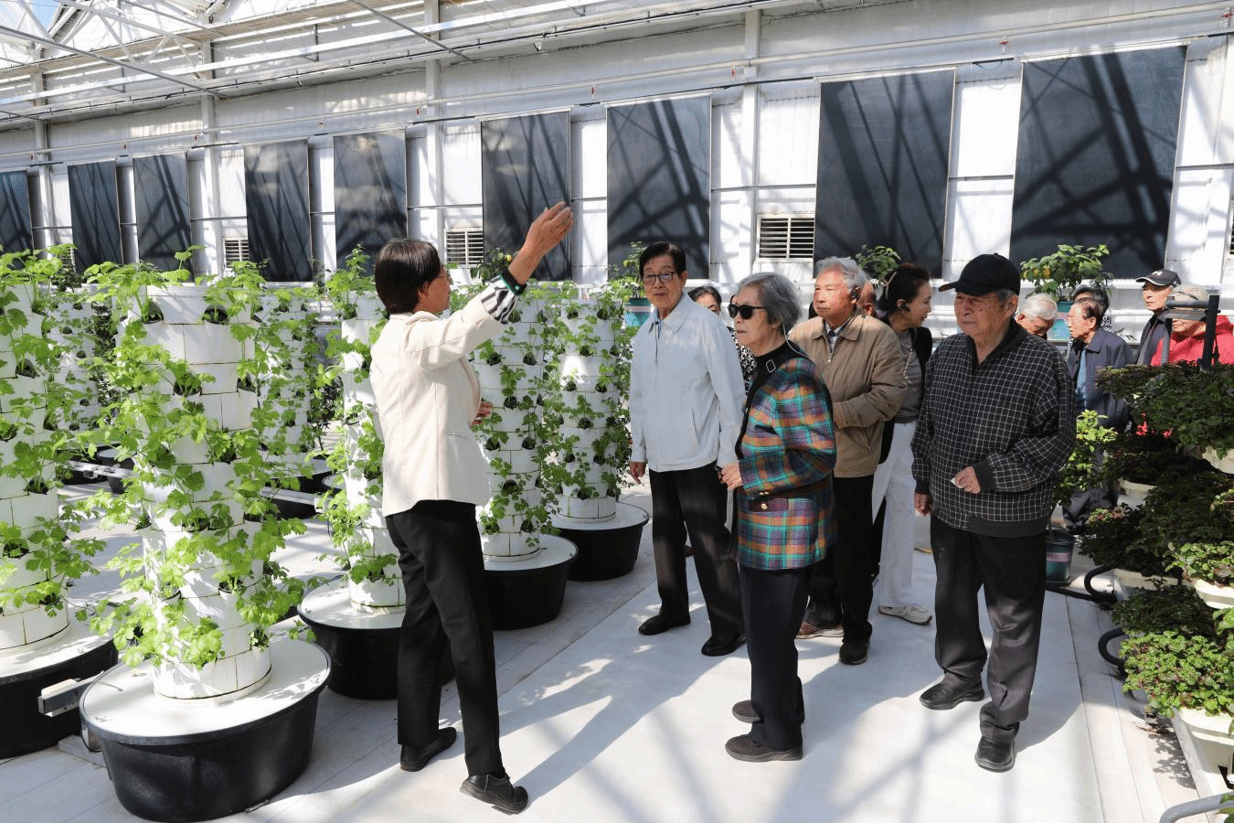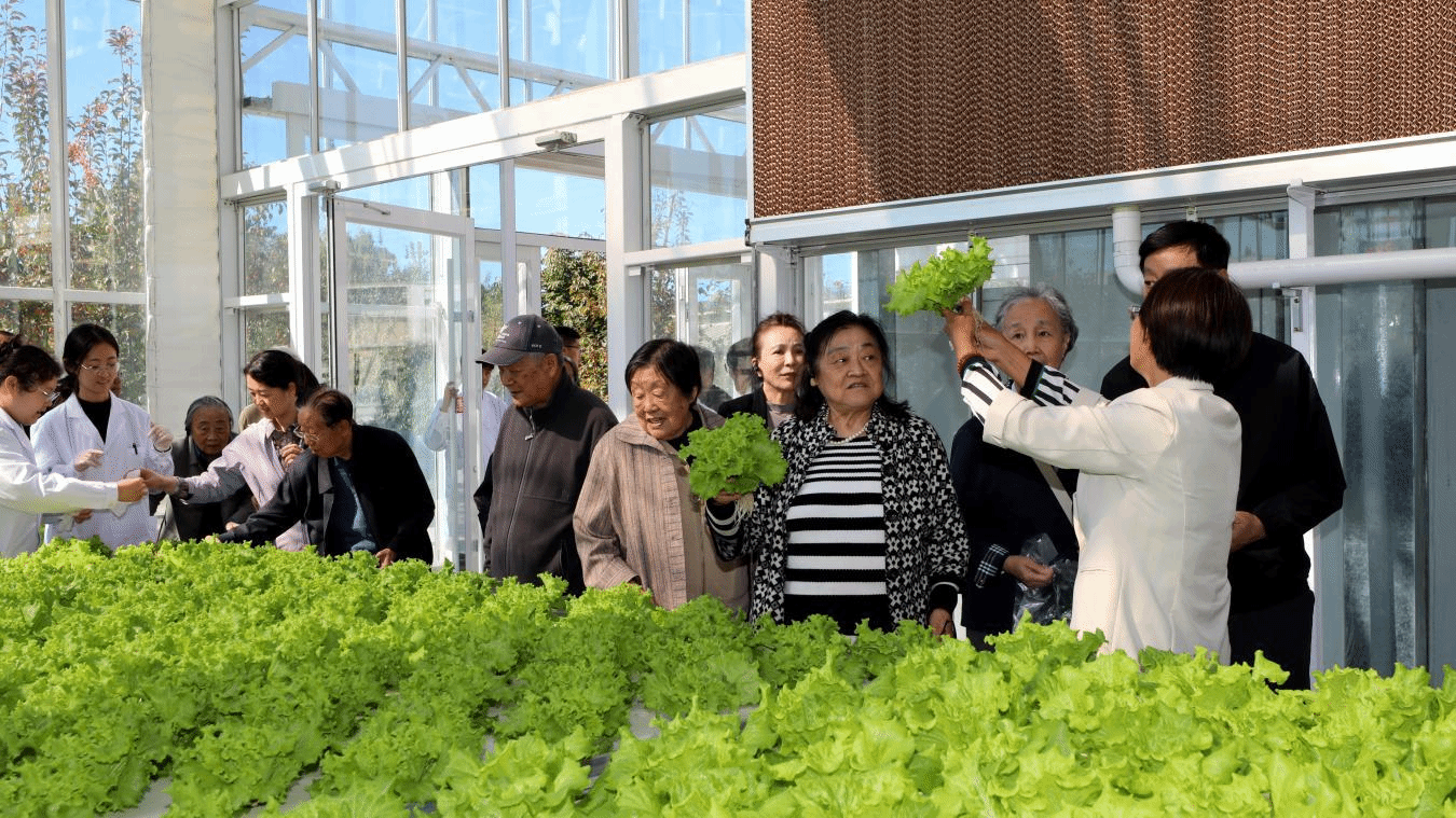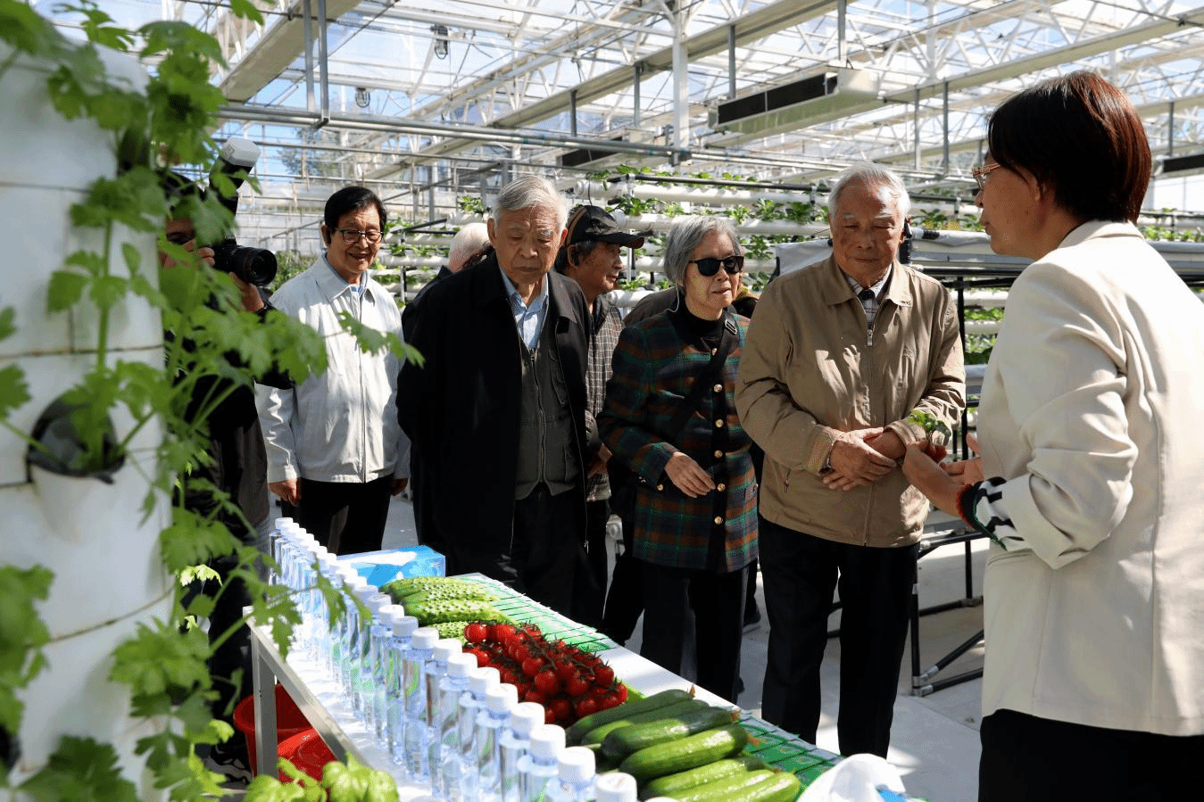 老同志们来到学校植物生产国家级实验教学示范中心基地,参观智能连栋温室,了解基地建设进展和师生服务乡村振兴的成效。