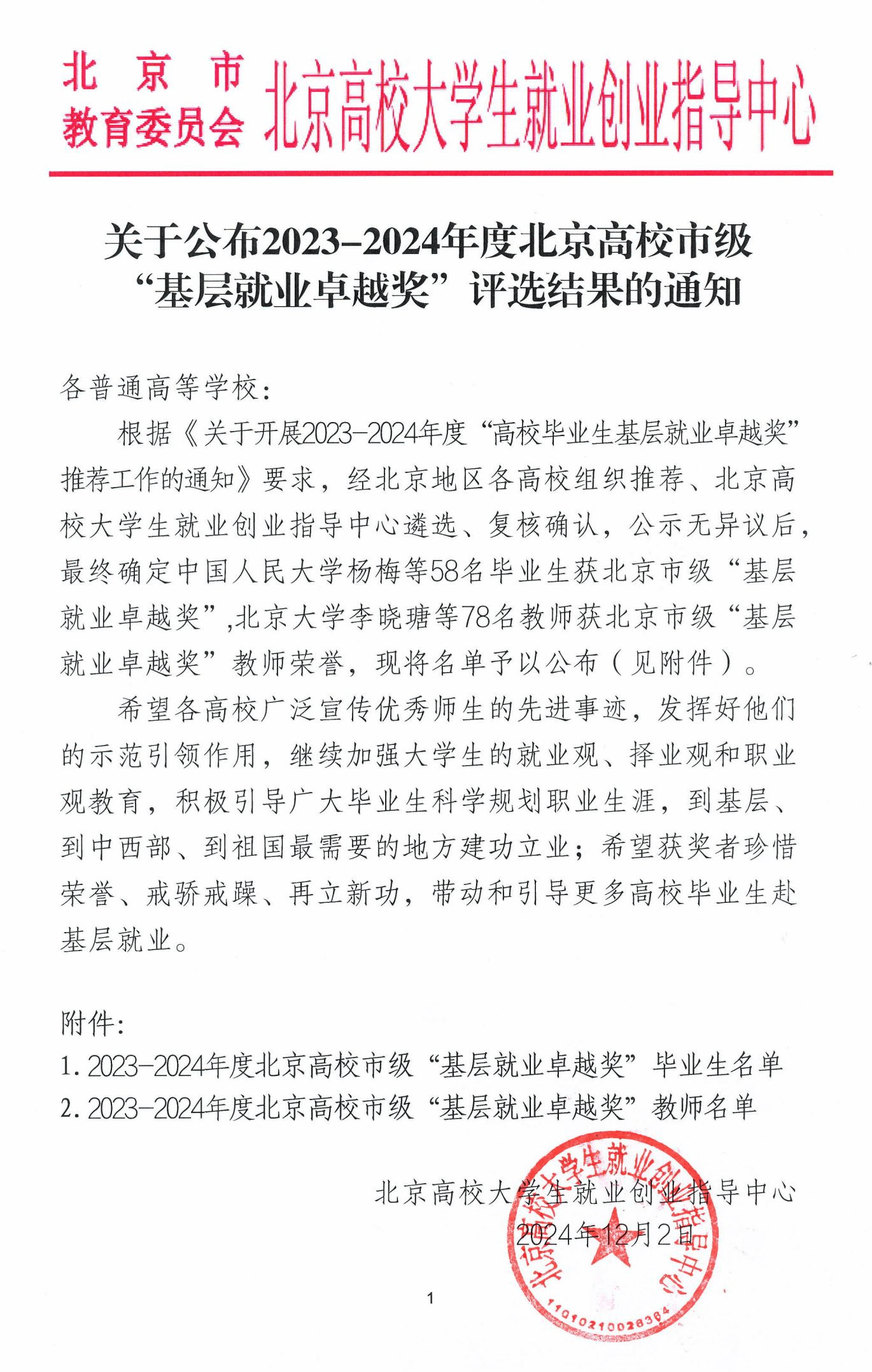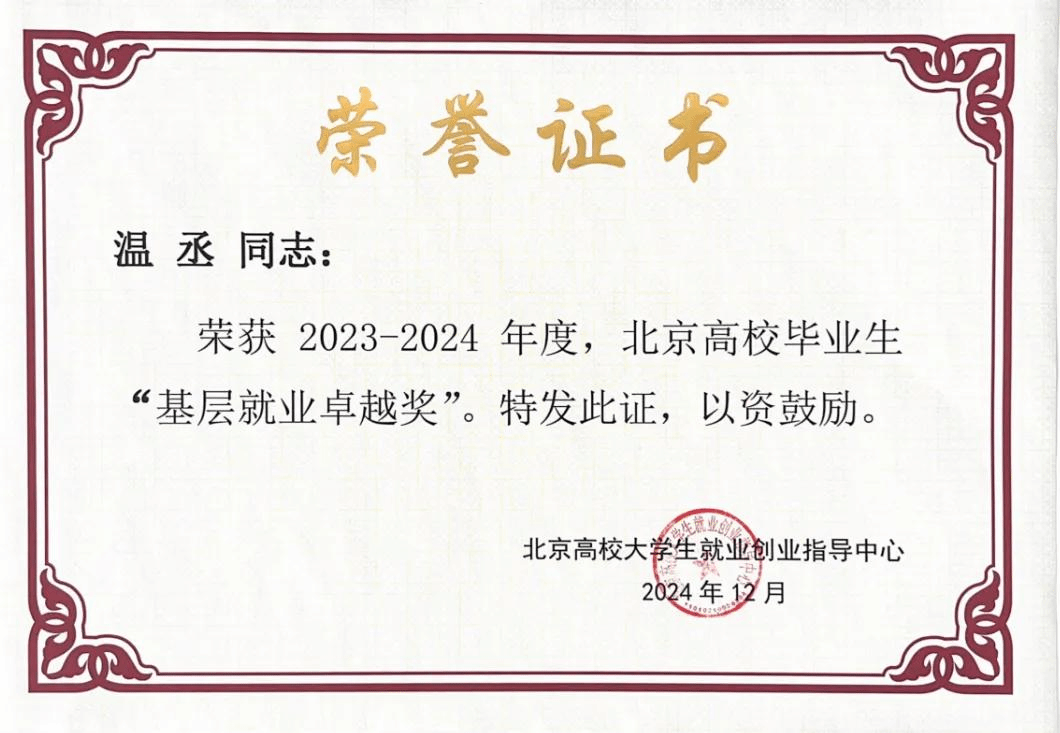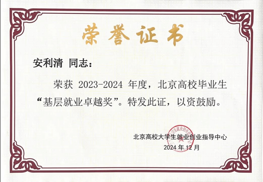 据悉,“高校毕业生基层就业卓越奖”是为奖励赴基层就业并做出突出业绩的普通高校毕业生和普通高校在指导服务大学生赴基层就业工作方面做出突出贡献的教师。此次共有58名毕业生获评北京市级“基层就业卓越奖”,78名教师获评北京市级“基层就业卓越奖”教师荣誉。