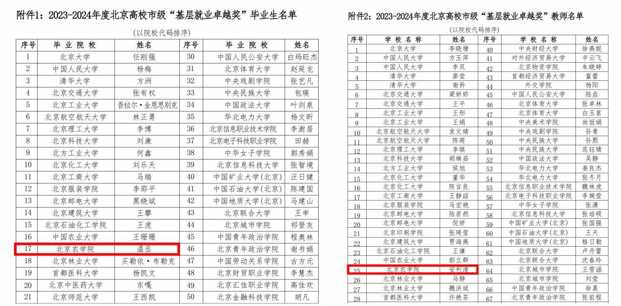 近日,北京市教育委员会、北京高校大学生就业创业指导中心公布2023-2024年度北京高校市级“基层就业卓越奖”获奖名单。beat365官网文法与城乡发展学院2013级毕业生温丞、生物与资源环境学院辅导员安利清老师获评“基层就业卓越奖”。
