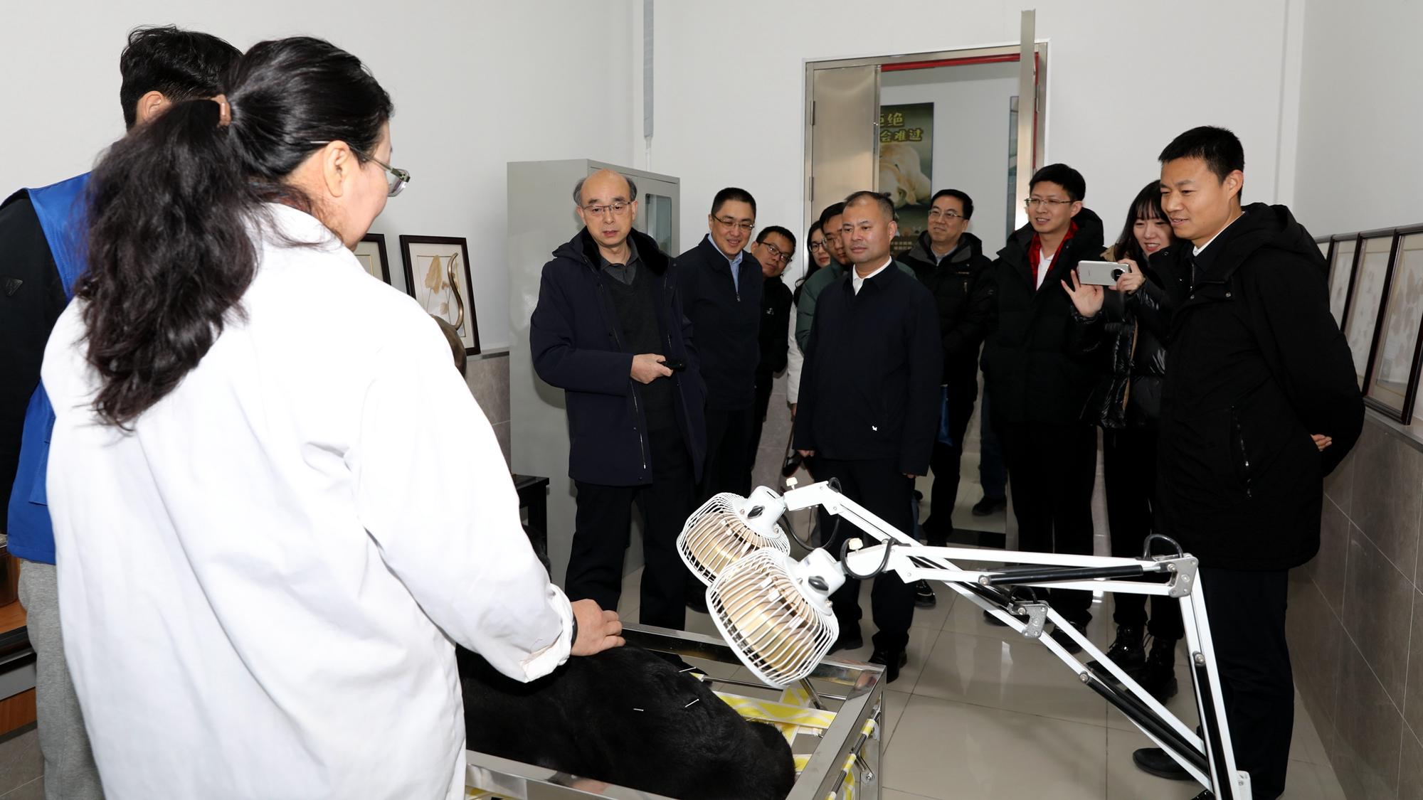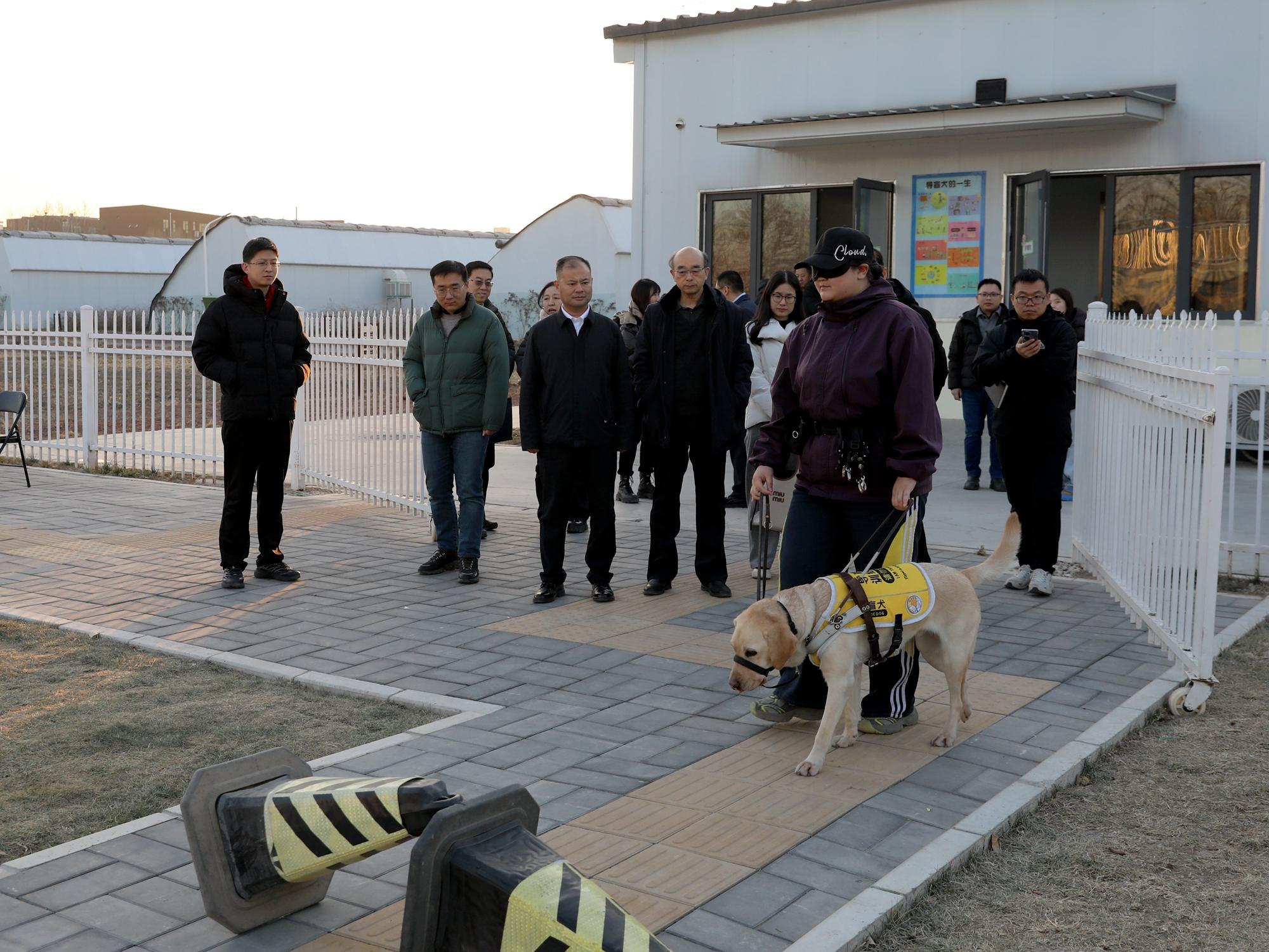 黄英锋一行实地调研了导盲犬培训示范中心,察看了犬舍、中兽医诊疗室、诊断处置室以及训练场等,观看了导盲犬工作展示,深入了解导盲犬日常养护、训练,基地建设运行情况,对学校发挥学科专业优势推动北京市导盲犬培训基地建设取得的进展给予充分肯定。
