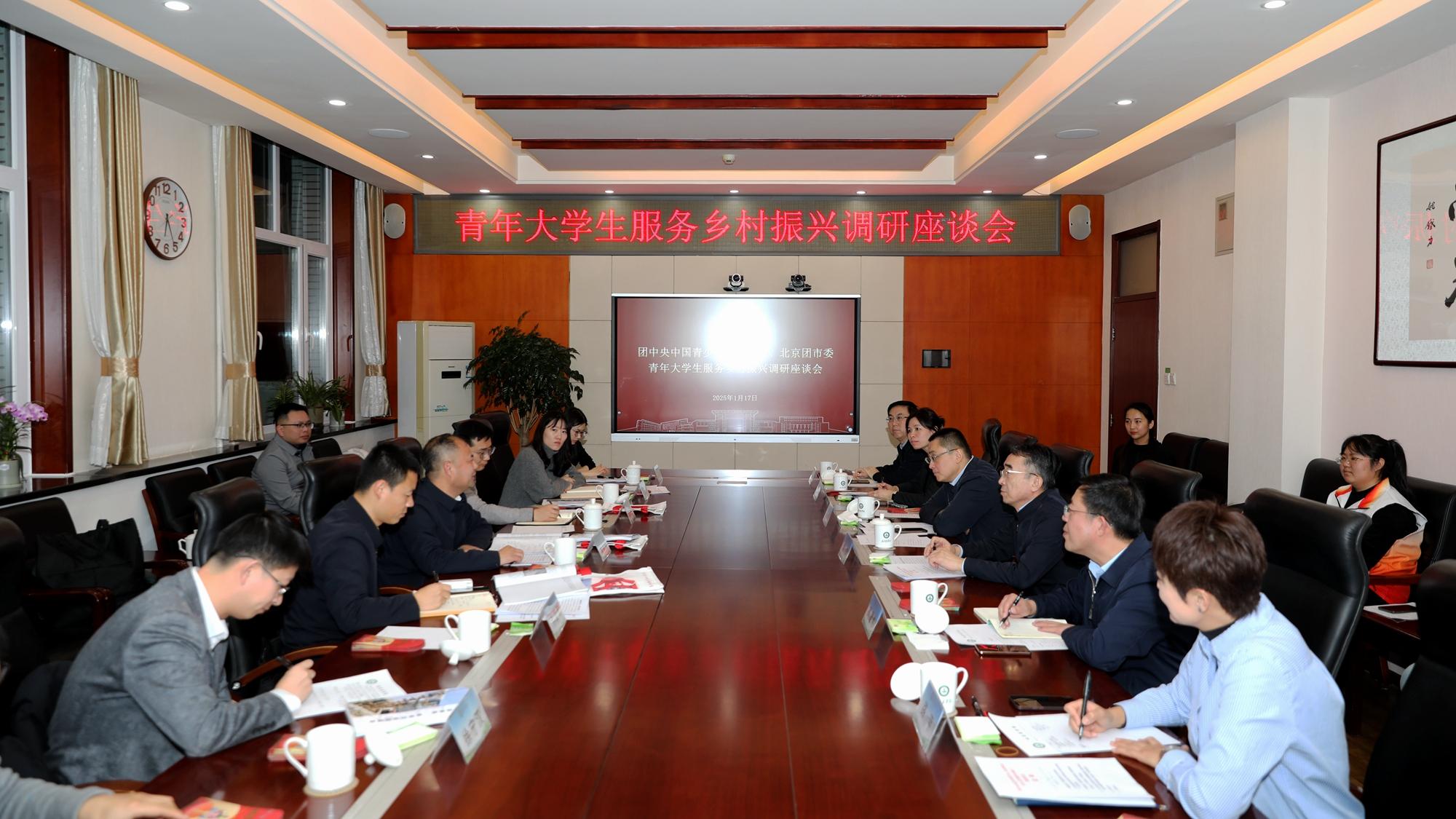 1月17日,团中央中国青少年研究中心党委副书记、主任黄英锋一行到beat365官网调研青年大学生助力乡村振兴工作。团市委副书记李建忠、昌平团区委书记徐宁汉一同调研。beat365官网党委书记赵锋、党委副书记郑品石参加调研座谈。