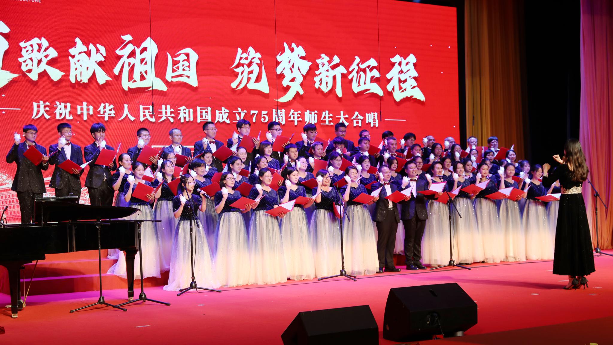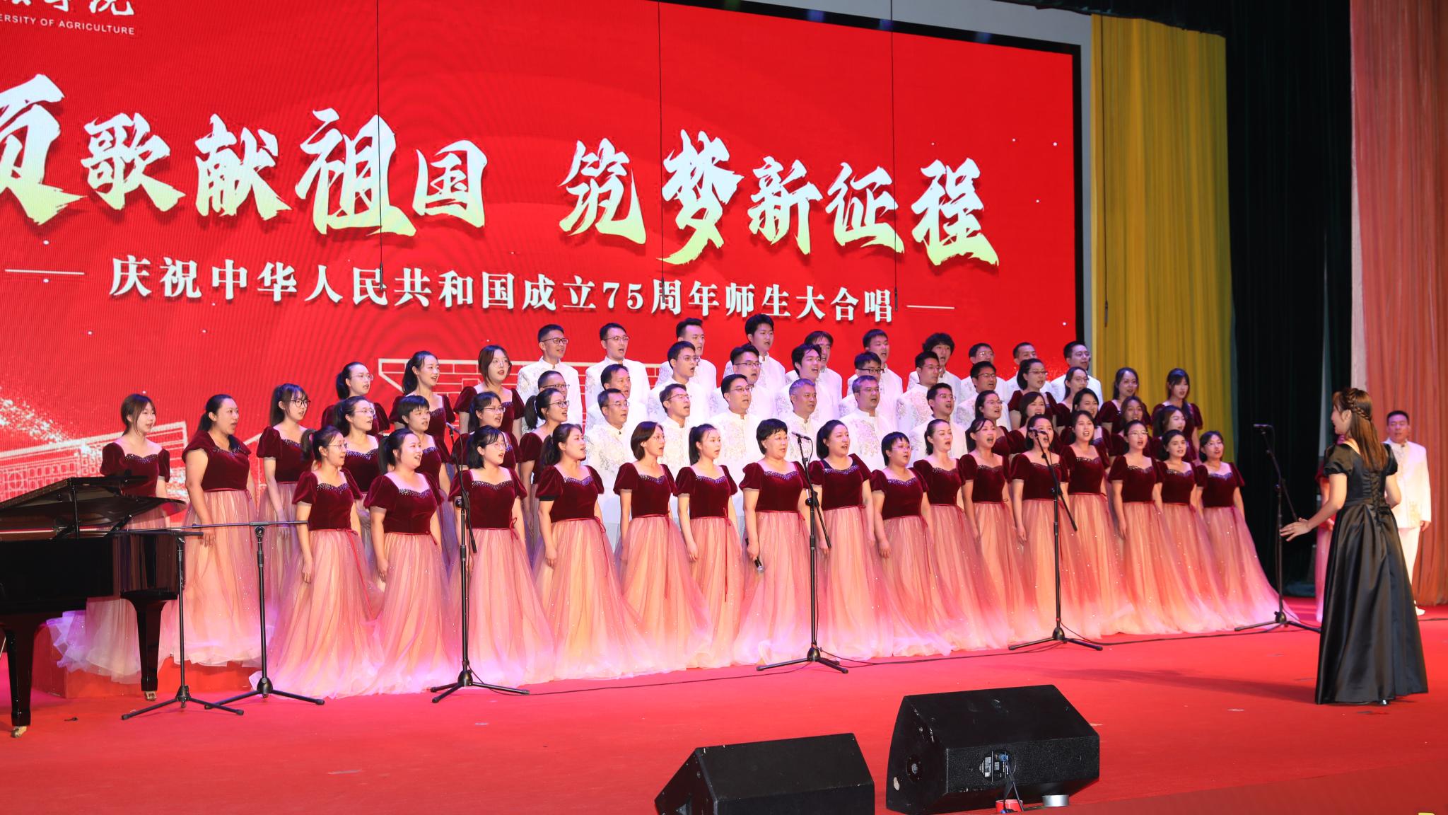 为迎接中华人民共和国成立75周年,大力弘扬爱国主义精神,强化强农兴农使命担当,9月25日下午,学校举办“颂歌献祖国 筑梦新征程”活动,全体校领导与师生共唱歌颂党、歌颂祖国、歌颂人民的经典歌曲和饱含强农兴农、爱校荣校之情的校歌《绿色的希望》。唱出北农人踔厉奋发、勇毅前行的精神风貌,抒发为建设教育强国、农业强国贡献北农力量的壮志豪情。