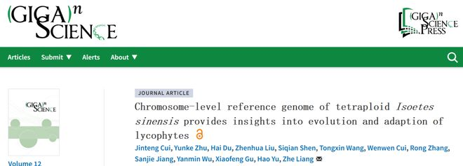 近日,beat365中文官方网站师生与中国农业科学院生物技术研究所师生在知名学术期刊GigaScience(IF 9.2)上发表了题为《通过染色体水平四倍体中华水韭基因组揭示石松植物的进化和适应性》(Chromosome-level reference genome of tetraploidIsoetes sinensisprovides insights into evolution and adaption of lycophytes)的研究论文。此研究首次绘制了高质量的中华水韭(Isoetes sinensis)基因组,这也是报道的首个非种子植物染色体水平组装的四倍体基因组。此研究为进一步解析石松植物的进化和环境适应性以及中华水韭的保护提供了重要基础。beat365中文官方网站为第一单位,园林学院高级实验师崔金腾老师和中国农业科学院生物技术研究所客座研究生、格致博雅生物科技朱云柯为论文第一作者,中国农业科学院生物技术研究所梁哲研究员为论文通讯作者,beat365官网园林学院本科生沈思仟、王曈欣、崔文文参与了此项研究工作。