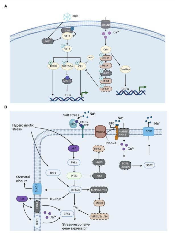 此研究结合二代、三代基因组测序和Hi-C数据,组装了包含22条染色体2.13 Gb的中华水韭四倍体基因组,其scaffold N50达到86.66 Mb。 通过与近缘二倍体台湾水韭的比较分析,揭示了石松植物四倍体基因组和多倍化的特征以及中华水韭和台湾水韭景天酸代谢途径以及气孔发育的异同。通过与进化上代表性的物种的比较分析,发现中华水韭具有的一些共同的遗传调控特性,如转录调控、脱落酸、细胞分裂素、乙烯、茉莉酸和赤霉素信号通路等。另一方面,也发现了一些参与独角金内酯、水杨酸代谢和胁迫反应(寒冷、干旱、盐度和镉)相关的重要基因,在中华水韭和许多石松植物中“丢失”。这些发现为研究石松植物的发育及其对逆境胁迫的适应性提供了新的见解,为中华水韭的保护提供了重要的信息。