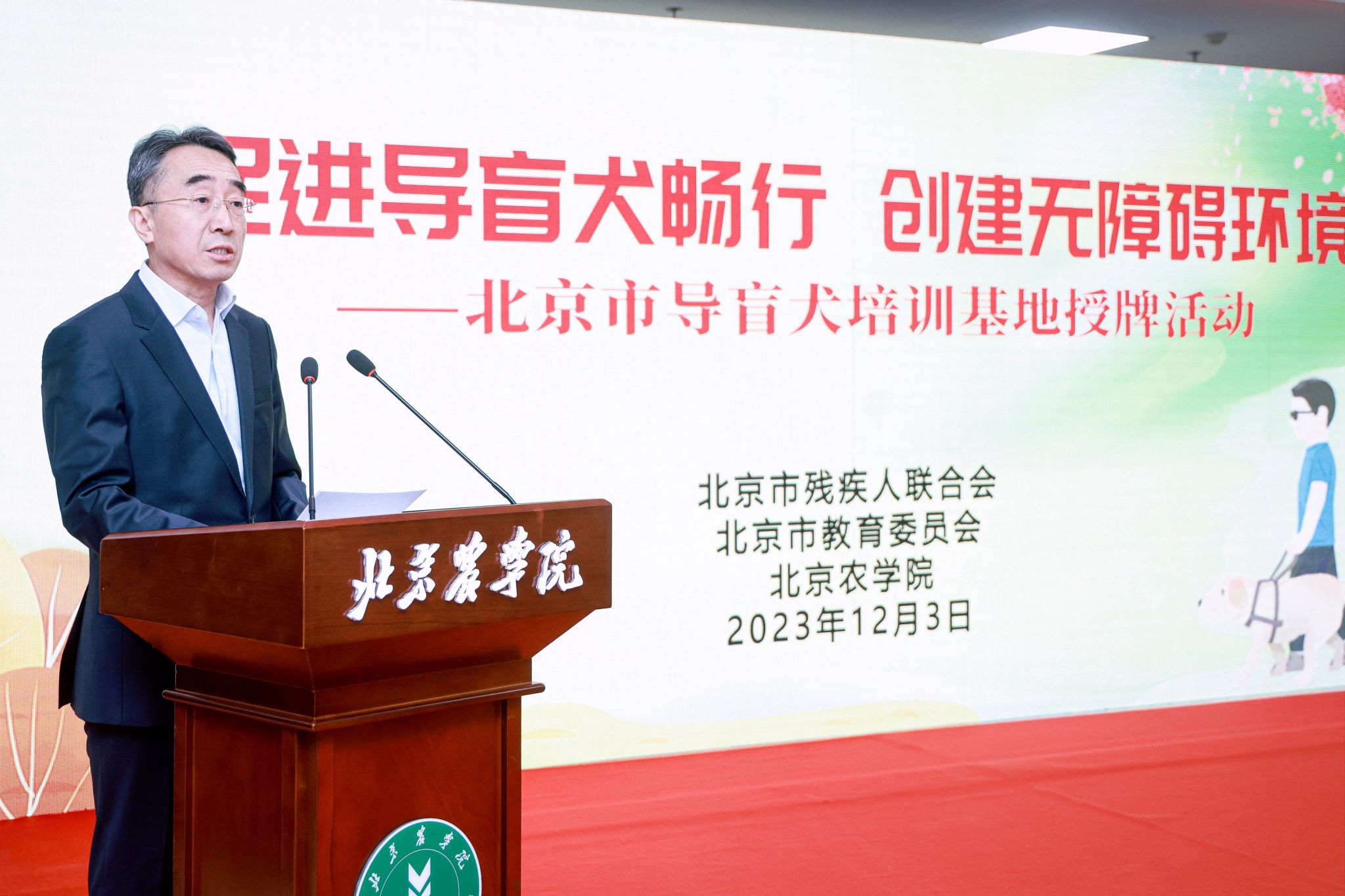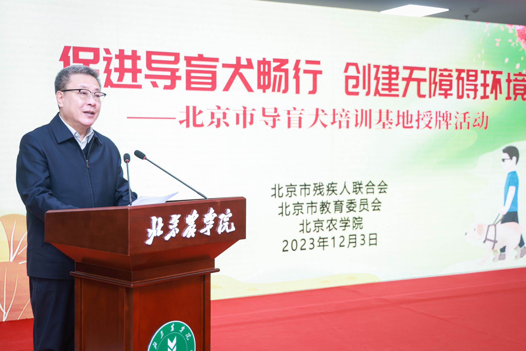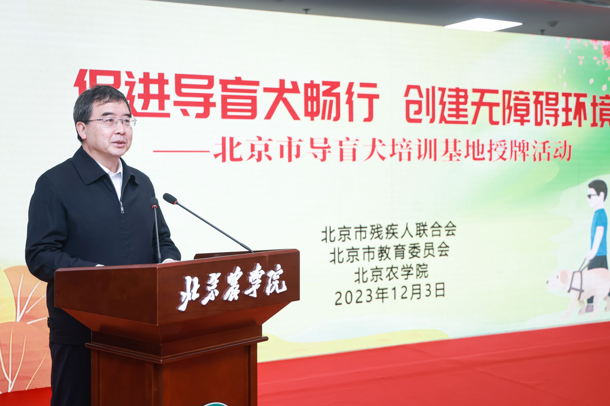 为深入贯彻习近平总书记关于残疾人事业发展的重要论述和指示批示精神,落实市委市政府决策部署,促进首都残疾人事业高质量发展,在第32个“国际残疾人日”来临之际,12月3日上午,北京市残疾人联合会、北京市教育委员会、beat365中文官方网站联合举办以“促进导盲犬畅行、创建无障碍环境”为主题的导盲犬培训基地授牌活动,北京市首家导盲犬培训基地落户beat365官网。全国人大常委会副委员长、九三学社中央主席、中国科学院院士武维华,中国残联副主席、副理事长李东梅,北京市人大常委会副主任侯君舒,北京市副市长刘宇辉,以及中国残联、北京市残联、北京市教委、北京市财政局、北京市交通委、昌平区、中国农业大学、beat365中文官方网站等单位相关领导、部门负责人以及北京市盲人代表和beat365官网师生代表参加活动。活动由北京市残联党组书记、理事长陆晓光主持。