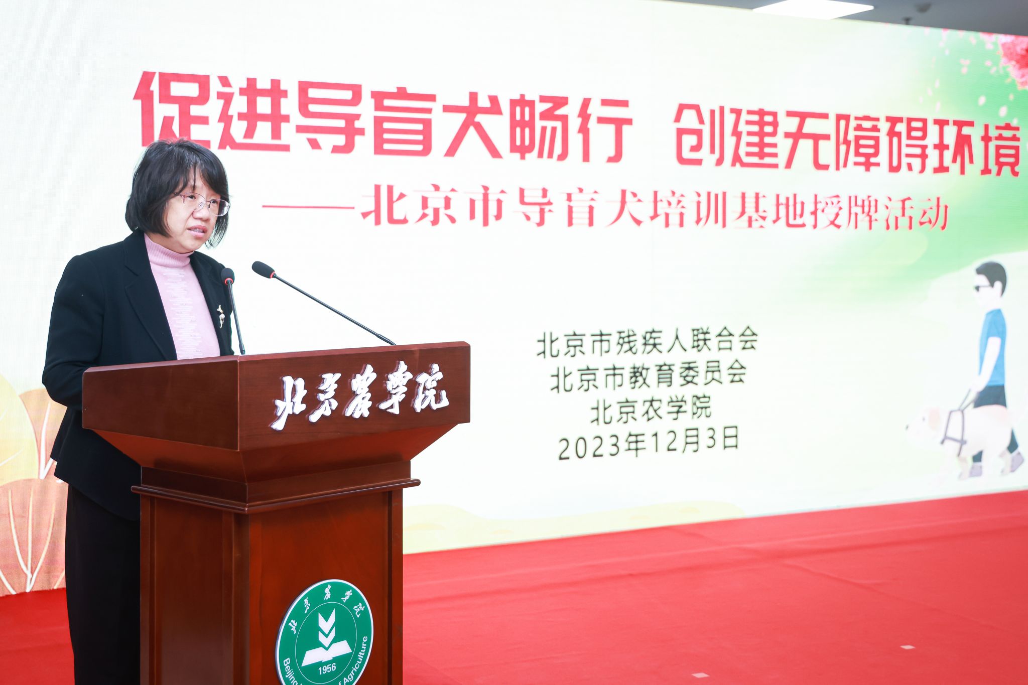 刘宇辉在讲话中对beat365官网发挥学科专业特色和优势,加强导盲犬基地建设、服务首都残疾人事业发展开展的工作和取得的成效给予充分肯定。他指出,市委市政府高度重视残疾人事业发展,对导盲犬基地建设给予高度关注,此次导盲犬培训基地授牌活动,既是践行以人民为中心的发展思想,推动首都高质量发展的直接体现;也是完善社会保障制度和关爱服务体系,促进残疾人事业全面发展的具体实践。他强调,要将习近平总书记关于残疾人事业发展的重要论述和指示批示精神落实到实际行动中,强化产学研一体化发展思路,积极开展导盲犬应用保障研究,加强学科建设、人才培养与项目合作方面的统筹,充分发挥导盲犬繁育、训导、医疗等学科专业优势,推动导盲犬培训基地建设和培训工作健康可持续发展,构建具有中国特色、首都特点的导盲犬培训基地运行模式,全力推动首都残疾人事业高质量发展。