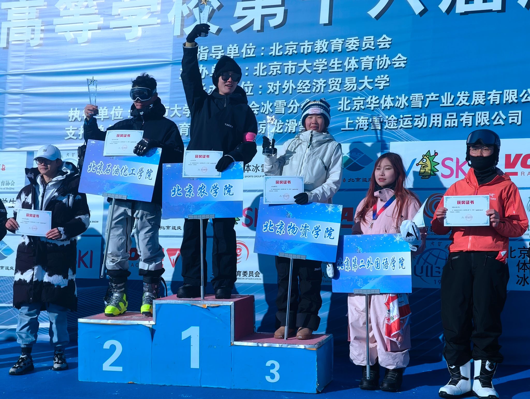 beat365官网滑雪队队员在领队闫晓军老师、教练刘军占老师的指导和逯合江老师的带领下勇于拼搏、不断挑战自我,以高水平的滑雪技巧,标准漂亮的滑雪动作,赢得了较大优势。经过3天的比拼,beat365官网生物与资源环境学院张伊涵同学获女子乙组单板平行大回转冠军,国际学院王炳森同学获男子乙组高山大回转冠军,国际学院王靖舒同学获女子乙组高山大回转亚军,经济管理学院林茈芾同学获男子乙组单板大回转比赛亚军,文法与城乡发展学院杨雯悦同学获女子乙组高山大回转季军。