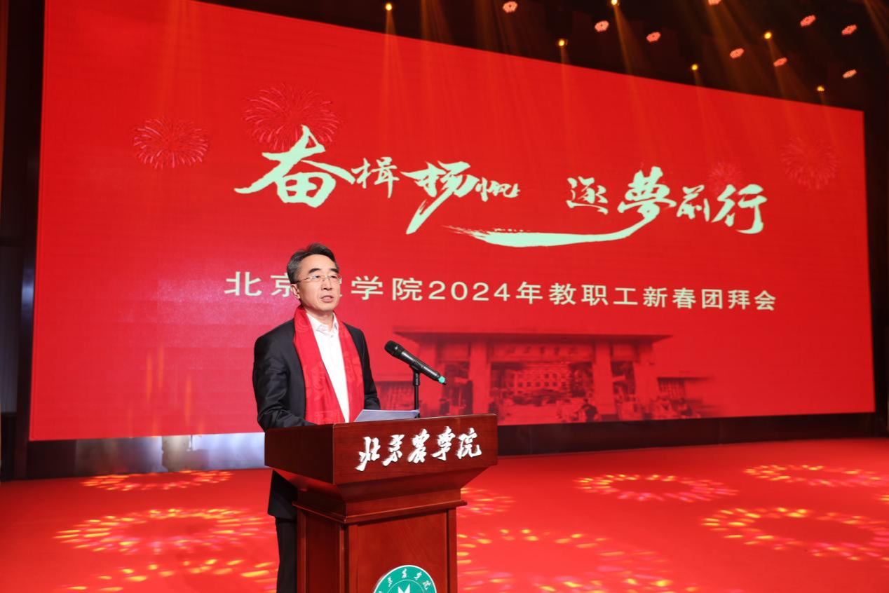 党委书记赵锋在致辞中深情回顾了学校2023年以高质量党建引领事业高质量发展取得的显著成效,向过去一年为学校改革发展做出积极贡献的全校师生员工表示衷心感谢、致以美好祝愿。他指出,2024年是新中国成立75周年,让我们更加紧密地团结在以习近平同志为核心的党中央周围,深入学习贯彻党的二十大精神、北京市第十三次党代会精神,全面落实学校“十四五”规划和第四次党代会部署,努力在新领域新赛道上汇聚新动能、打造新优势、实现新突破,持续推动高质量党建引领高质量发展迈出新步伐、再上新台阶,凝心聚力加快建设国内一流国际知名都市农林特色高水平应用型大学,更好地服务新时代首都发展和全面推进乡村振兴,以实际行动回答好“强国建设、北农何为”重要时代课题。