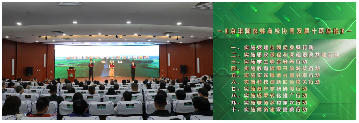 会上正式发布了《京津冀农林高校协同发展十项举措》《京津冀农林高校学生服务乡村振兴十条倡议》。三地农林高校牢牢把握高质量发展这个首要任务,坚持同题共答,强化协同创新,全面提高人才自主培养质量,增强科技赋能乡村振兴能力,奋力谱写服务京津冀协同发展战略的农林篇章。