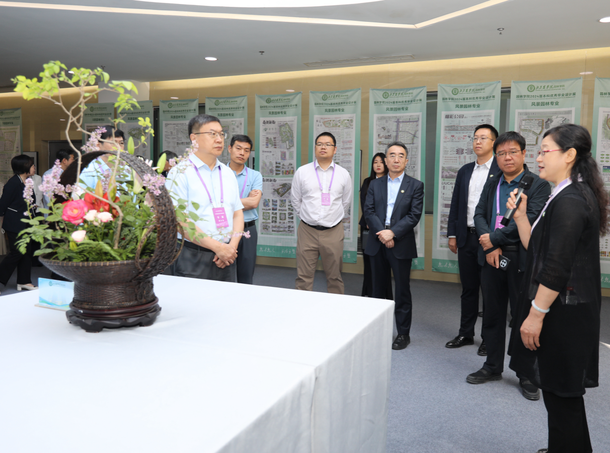 在园林学院,专家组一行参观了风景园林、环境设计专业本科生优秀毕业设计作品展,了解学校聚焦乡村全面振兴、休闲农业发展需求培养高水平应用型都市农林人才的做法。现场观摩了师生插花艺术实践,了解学校立足专业特色,大力弘扬中国传统插花艺术和花文化,推动美育浸润工作更好落实的具体做法和成果。