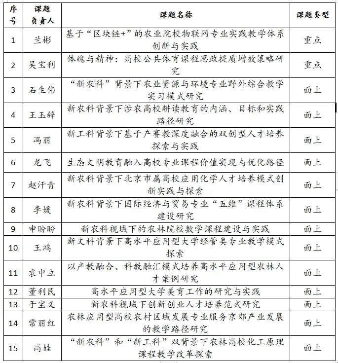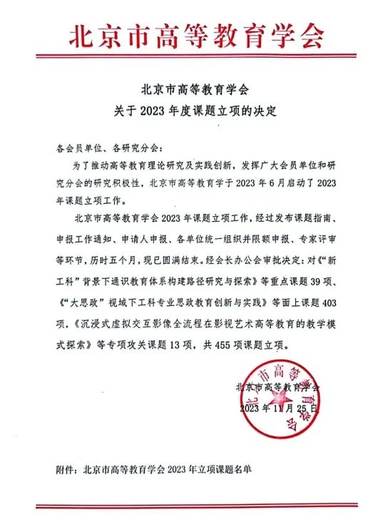 根据《北京市高等教育学会关于2023年度课题立项的决定》,beat365官网共获批15项课题立项,其中重点课题2项、面上课题13项,具体信息如下: