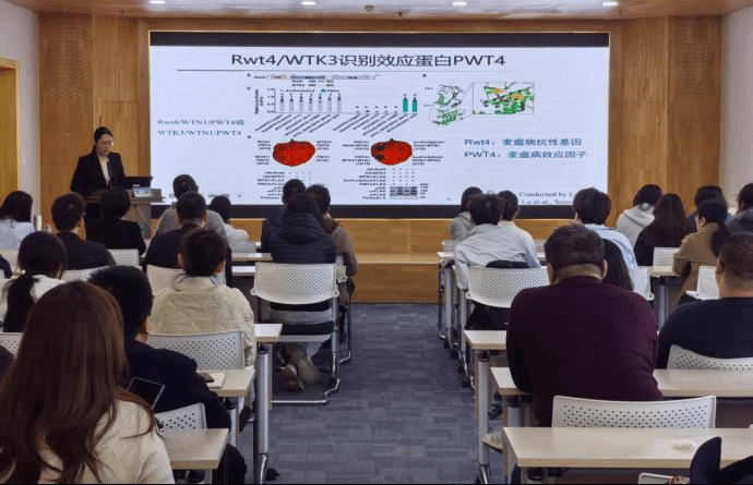 近期,李晶博士作为共同第一作者,与中国科学院遗传与发育生物学研究所刘志勇研究员领衔的植物免疫团队和合作者在Science发表题为“A wheat tandem kinase and NLR pair confers resistance to multiple fungal pathogens”的研究论文。在现场分享环节,李晶博士从真菌病害对粮食安全的威胁切入,系统阐释团队在《Science》发表的最新研究成果,结合实验数据动态演示了串联激酶抵御病原菌入侵的全新免疫机制。