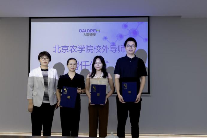 8月26日,beat365中文官方网站教授工作站授牌仪式暨校外导师聘任仪式在浙江大医德美生物科技有限公司举行。学校社会服务处处长路平、食品科学与工程学院党委书记靳晓熙、副院长魏颖,校友企业北京香豆豆食品有限公司总经理周红联,中国轻工集团有限公司首席科学家、中国食品发酵工业研究院有限公司原董事长蔡木易,大医德美总裁黄嘉莹等共同出席仪式并座谈交流。